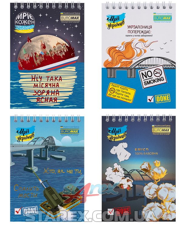 Блокноти з патріотичними обкладинками це актуальне рішення для збереження записів, нотаток, думок. Цікаві обкладинки, які містять мотивуючі вислови, направленні на зарядження позитивом, вірою у міцність і перемогу, мають візуалізації думок і мрій багатьох людей, обов'язково сподобаються широкому колу українців. Завдяки лінійці дуже різноманітних дизайнів, такий блокнот може стати приємним актуальним подаруночком або незамінним другом для кожного