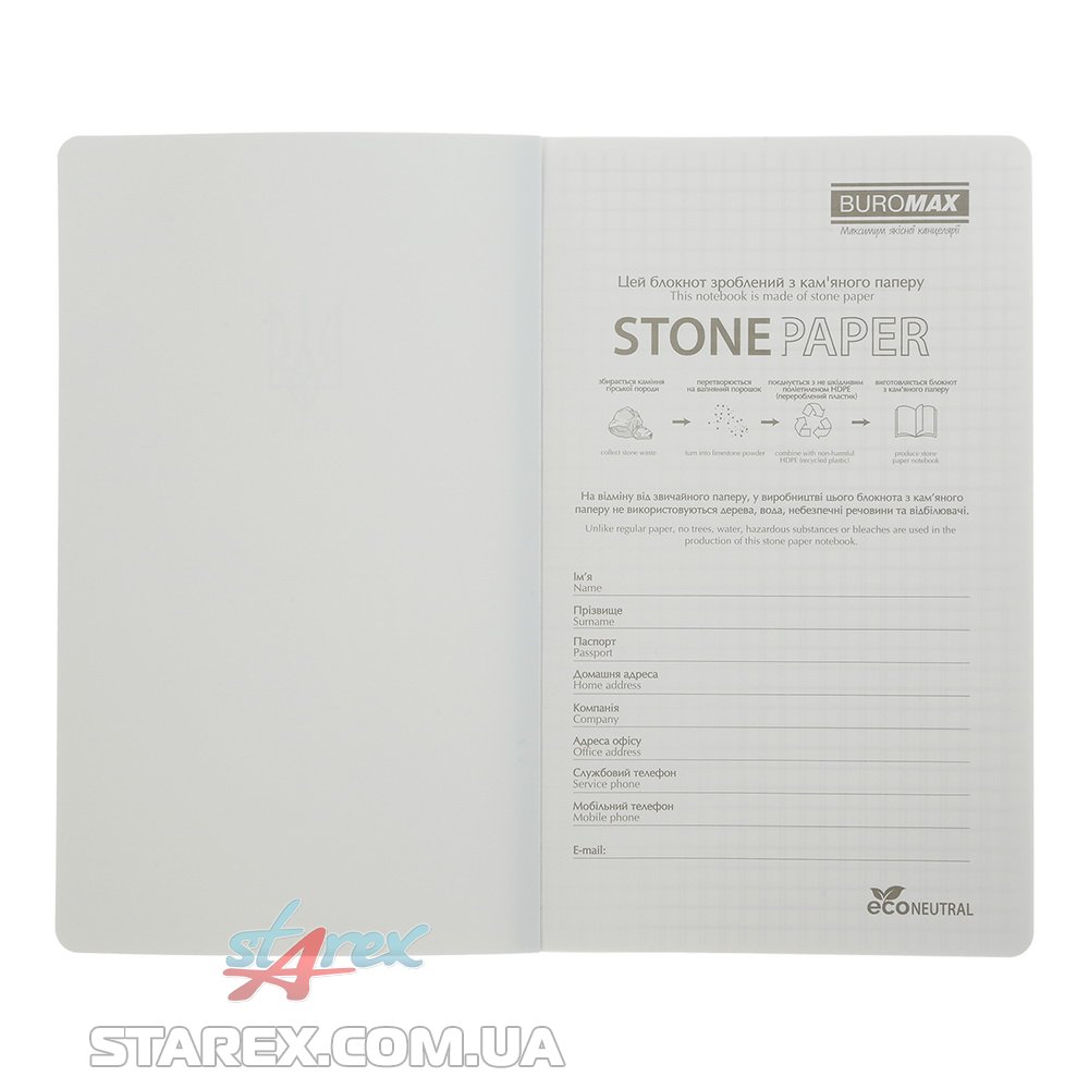 - вологостійка обкладинка з вапнякового каменю (щільність матеріалу 375г/м²), що візуально імітує натуральну шкіру