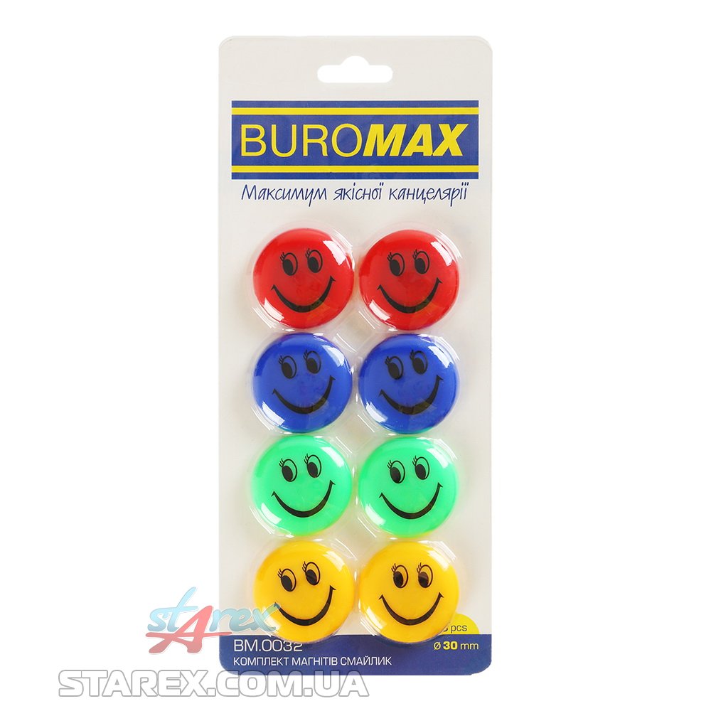 Комплект магнітних тримачів СМАЙЛИК від BUROMAX – надійно зафіксує Вашу інформацію на металевих поверхнях! Такі магнітики підійдуть для кріплення нотаток, замальовок, плакатів, планів, графіків та інших наочних матеріалів на магнітно-маркерних дошках та фліпчартах в офісах та конференц-залах, в навчальних закладах, а також в побуті, на звичайному холодильнику. А веселі смайлики, зображені на накладках, – це приємний бонус для гарного настрою!