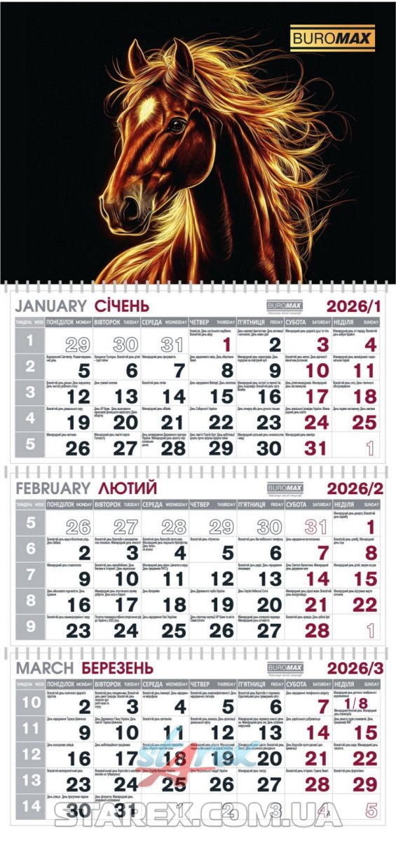 - Календар квартальний настінний на 2026 рік, на трьох пружинах
