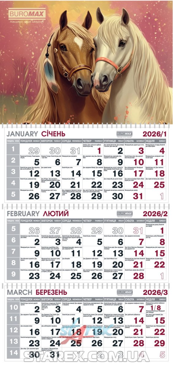 - Календар квартальний настінний на 2026 рік, на трьох пружинах