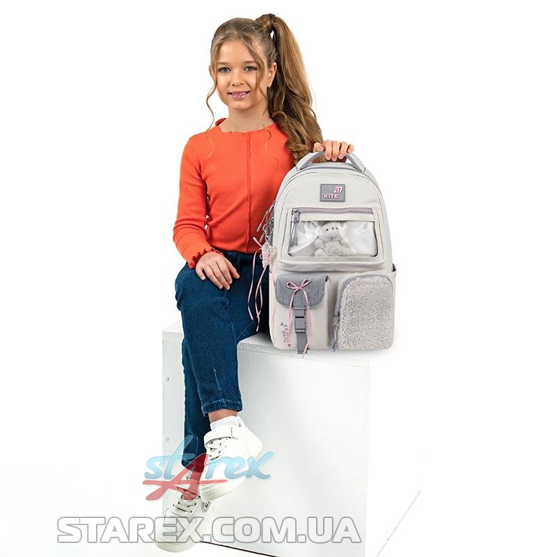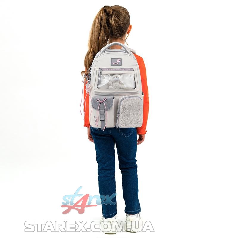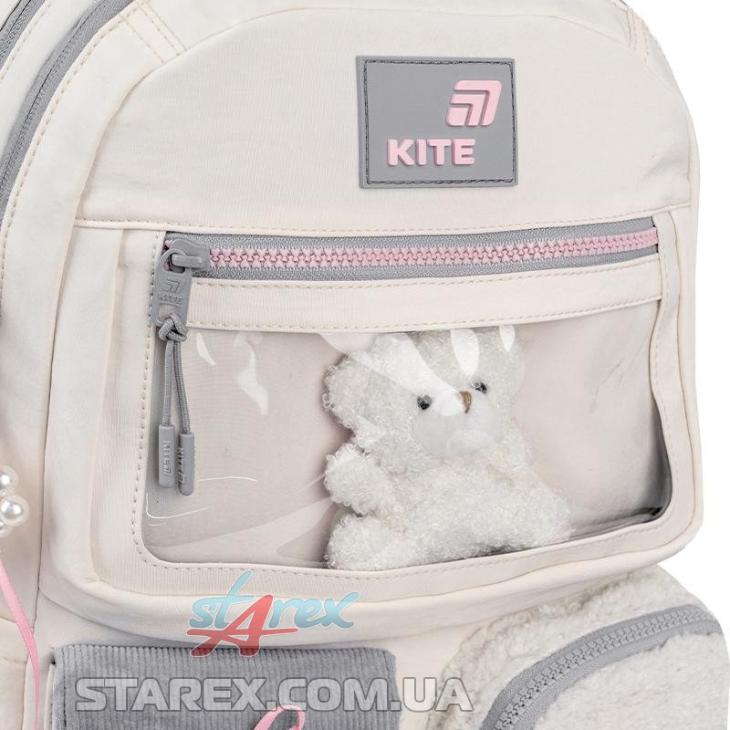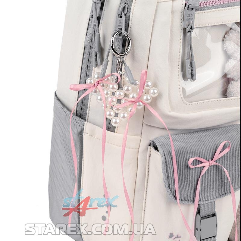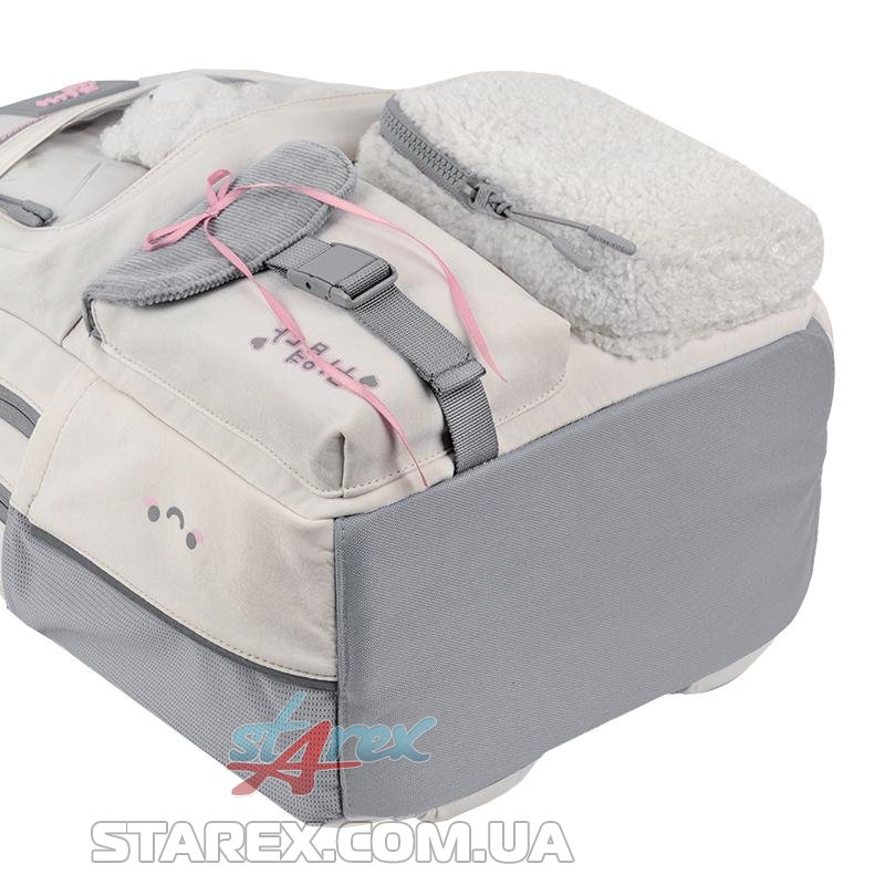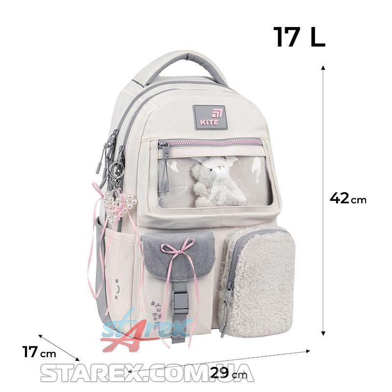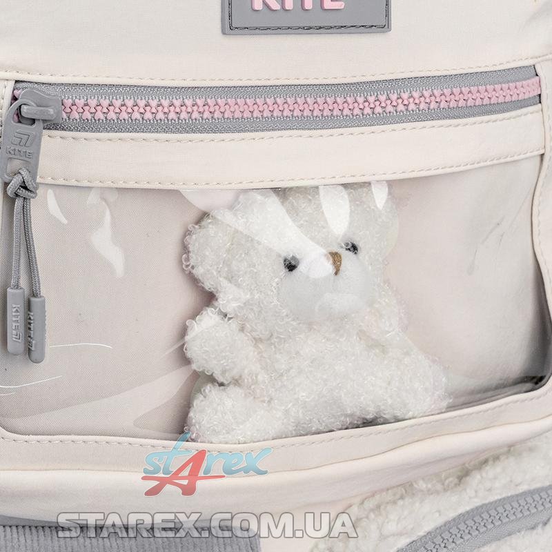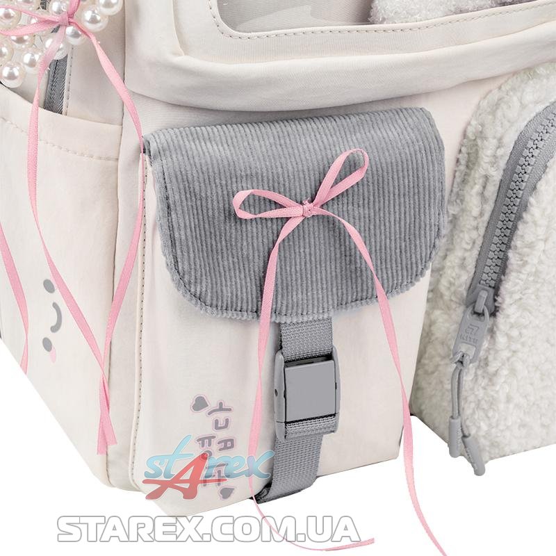 - декор: рюкзак виконаний із поліестеру з жатим ефектом в поєднанні з тканиною букле та вельветом; іграшка-ведмедик в прозорій кишені; об'ємний друк; нашитий бант із сатинової стрічки; блискавка із зубцями у формі сердечок на передній кишені; брелок-підвіска з намистин у формі серця з бантиками.
