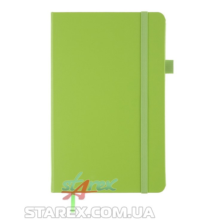 - Тверда обкладинка зі штучної шкіри з поздовжньою гумкою для фіксації блокнота в закритому стані