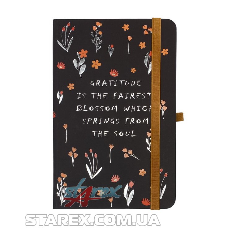 - Вертикальна гумка для фіксації блокнота в закритому стані й петелька для ручки одного кольору, у тон дизайну обкладинки