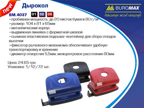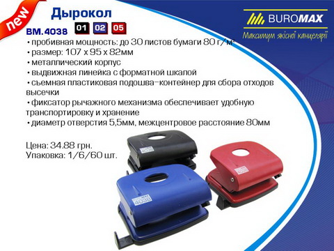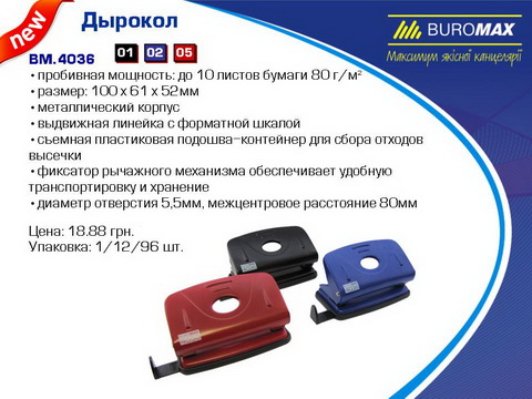Асортименти поповнився чудесними діркопробивачами в металевому корпусі, які пробивають 10, 20 і 30 аркушів паперу щільністю 80гр/м²