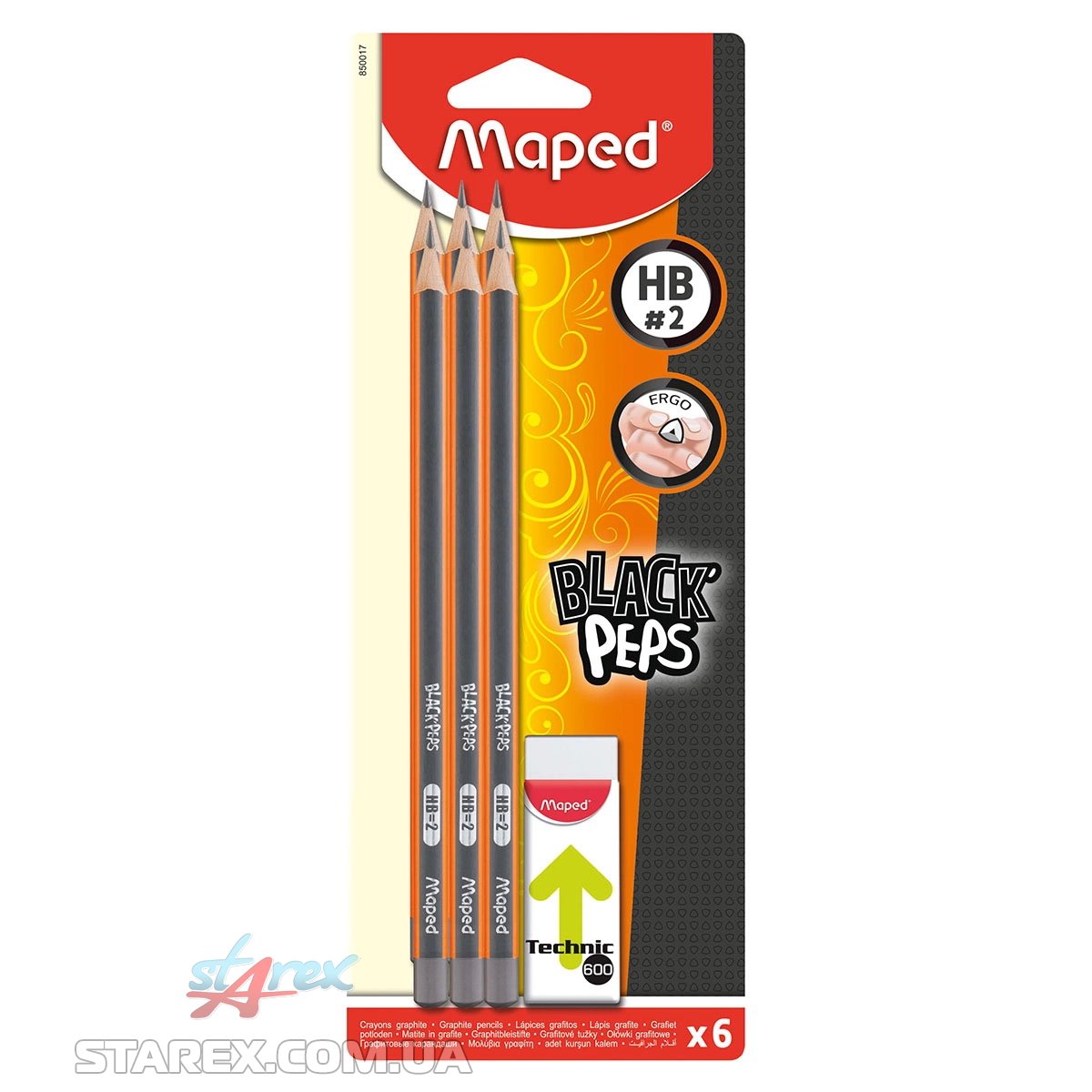 Набір з 6 чорнографітових олівців BLACK PEPS з гумкою TECHNIC в комплекті
