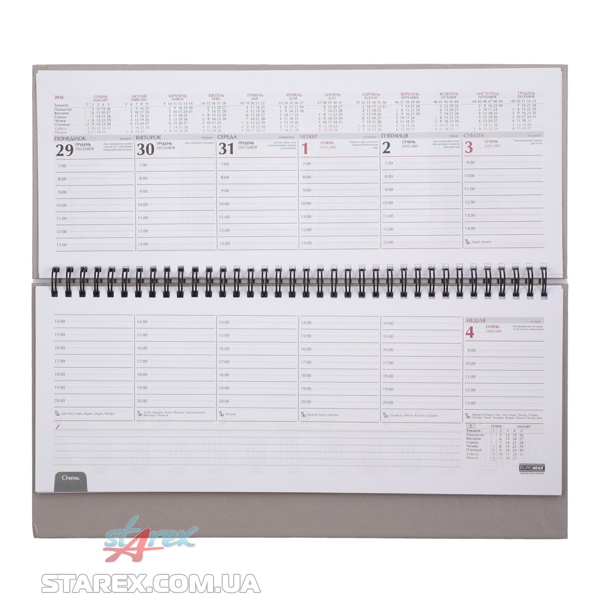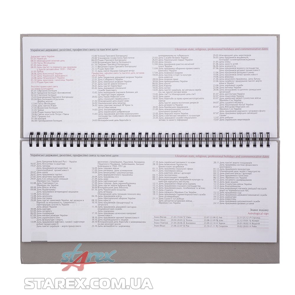 - Дві сторінки (розворот) містять вертикально розміщені 7 днів тижня (субота та неділя в одному стовпчику) з організатором часу від 7:00 до 20:00, календар на рік та на поточний місяць, знак зодіаку, іменинників, свята та пам'ятні дати на кожен день, а також вільне поле для нотаток