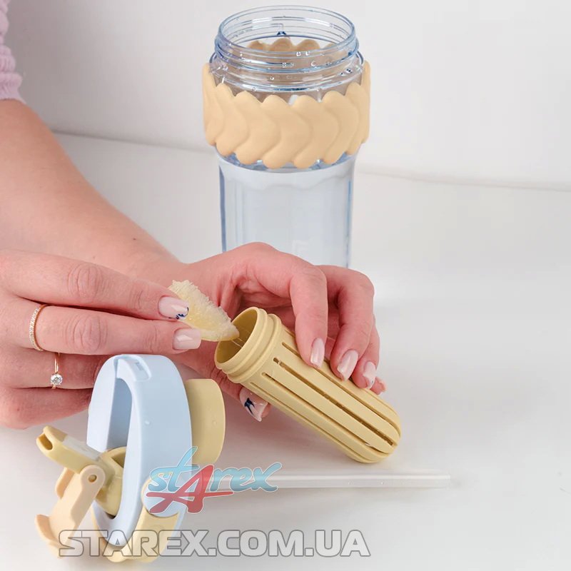 Корпус виготовлений із безпечного тритану — матеріалу, який не містить шкідливих речовин і не вбирає запахів. Усередині є знімна вставка для охолодження напоїв — достатньо покласти туди лід або заморожені ягоди. Стакан ідеально підійде для школи, прогулянок або активного відпочинку на природі.