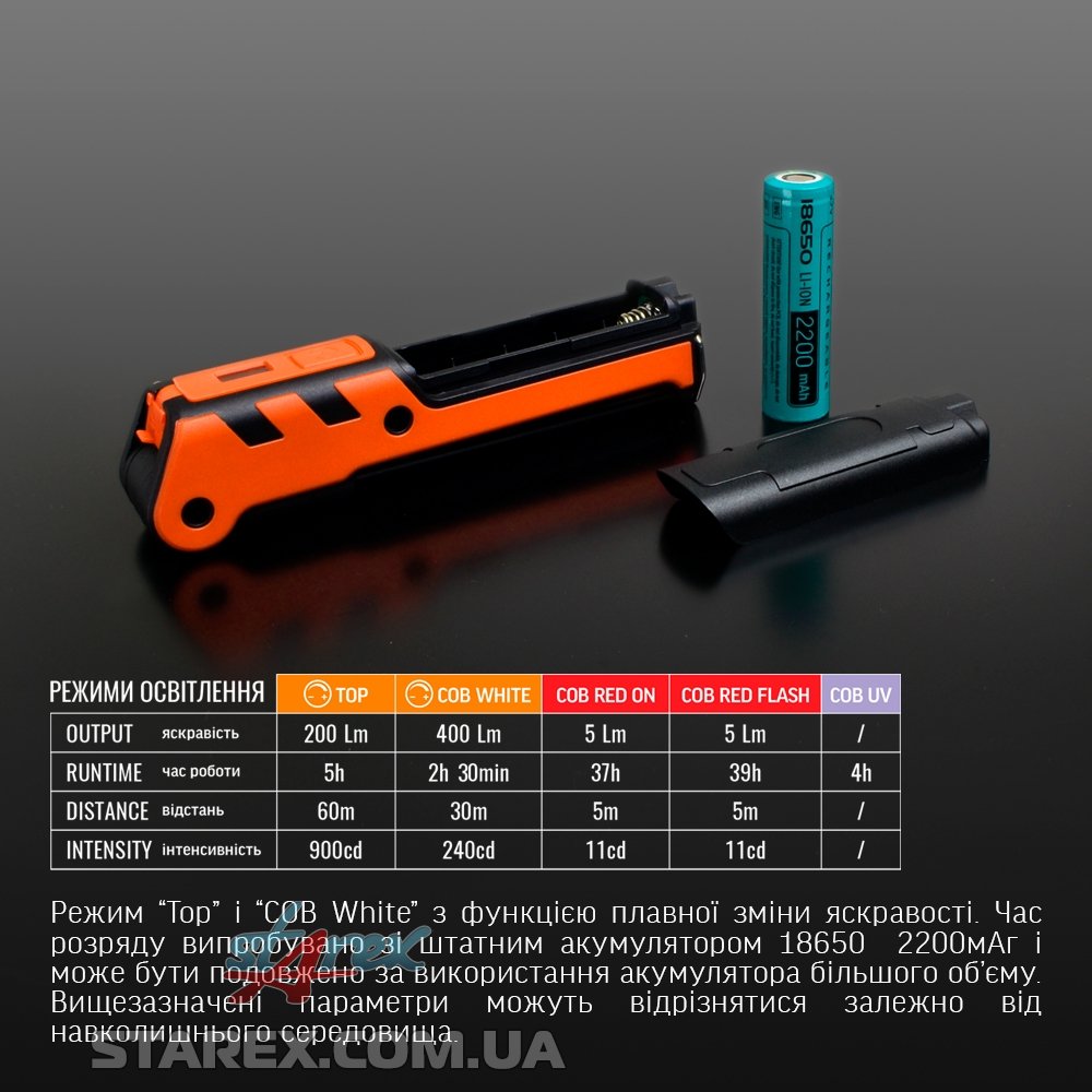 Коротке натискання кнопки "ON/OFF" – вмикання світла, перемикання між режимами «Top» і «COB White» та вимикання світла
