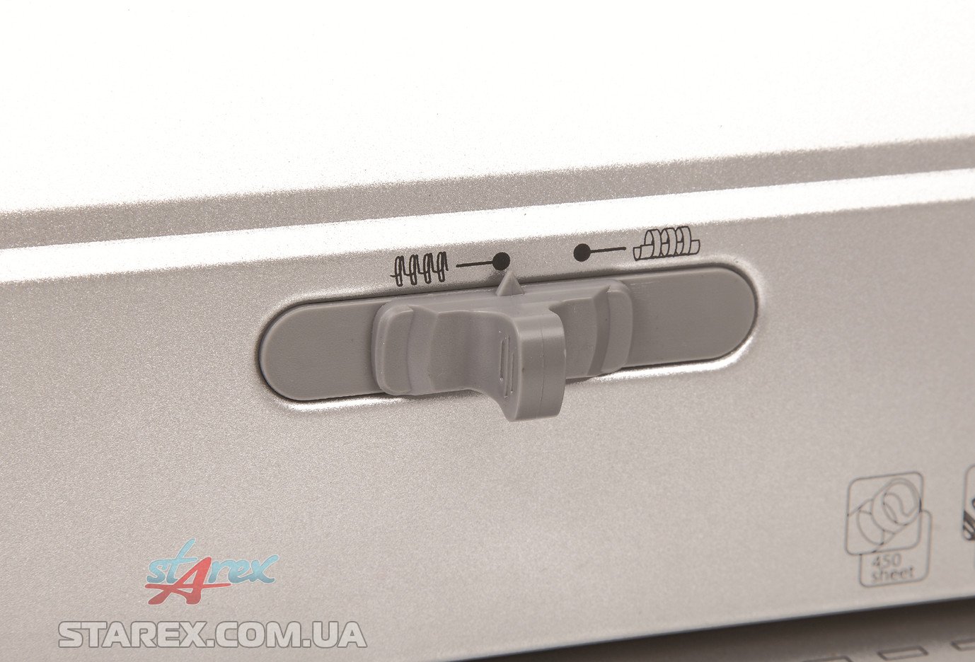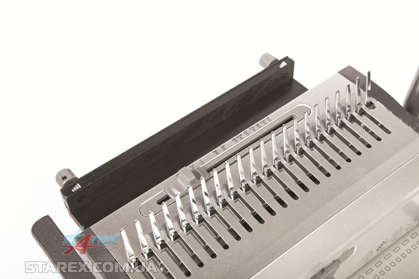 Универсальный перфобиндер для оперативной полиграфии. Предназначен для двух видов переплета: на пластиковую пружину (шаг 9/16) толщина переплета до 450 листов, а также на металлическую пружину (шаг 3:1) толщина переплета до 140 листов. Толщина перфорации до 20 листов бумаги 80г/м². Оснащен удобным переключателем между перфорационными режимами, регулировкой глубины перфорации на 3 положения: 2мм/4мм/6мм. Для удобства на рабочей поверхности биндера насена пошаговая инструкция по эксплуатации переплетчика. Перфорация и переплет осуществляется отдельными рычагами. Выполнен полностью в металлическом корпусе.