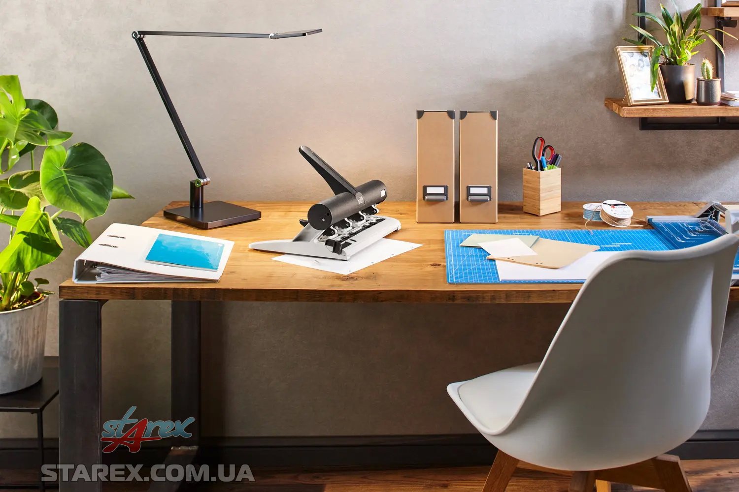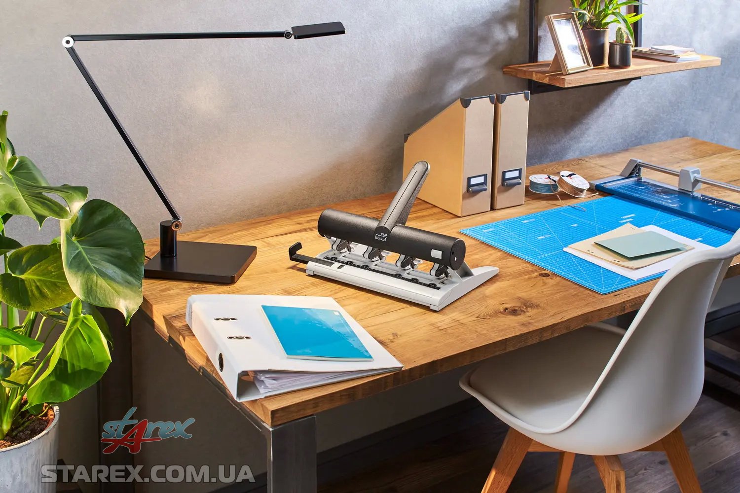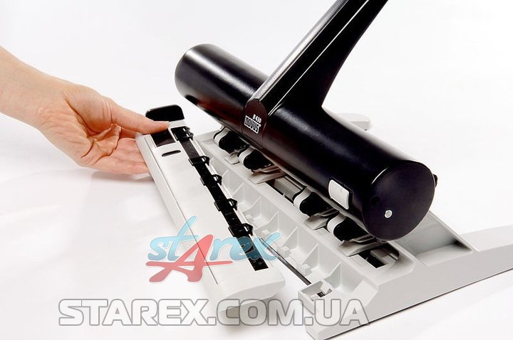 Важіль з фіксатором для компактного зберігання. Стійкі та нековзаючі ніжки-опори. 4 окремих, легко регулюємі пробивних різця на пружинах. Запатентована знімна лінійка-фіксатор для зручного регулювання формату пробивання отворів. Вага: близько 2280 г. Максимальна кіл-ть аркушів: 30. Гарантія: 10 років.