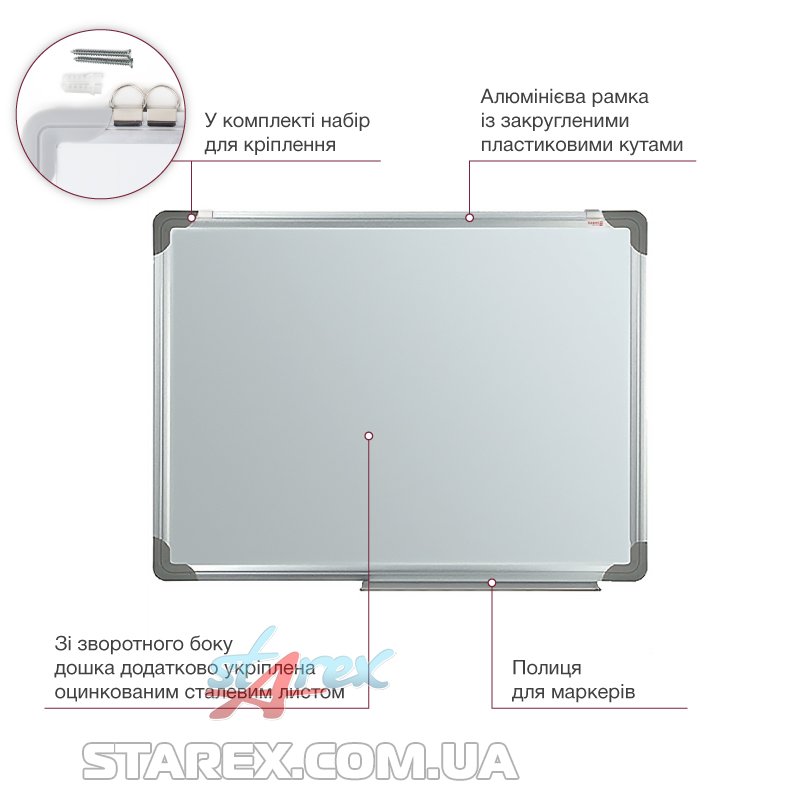 Визуальная коммуникация - незаменимый инструмент в процессе проведения презентаций, совещаний, встреч, обучающих занятий. Сухостираемые доски - один из инструментов визуальной коммуникации, они активно используются в офисах, школах, на тренингах, курсах, а также дома. Сухостираемые доски - это еще и прекрасные хранители информации: записки, счета и квитанции никогда не потеряются, если прикрепить их магнитом к доске. Сухостираемые доски Delta by Axent имеют качественное покрытие, рамка изготовлена из анодированного алюминия серебристого цвета, устойчива к царапинам и повышенной влажности. С обратной стороны доска дополнительно укреплено оцинкованным стальным листом. Рамка имеет округлённые пластиковые углы с передвижными креплениями к стене, в 2-х точках. В комплекте с доской идет полочка, куда можно положить маркеры и губки для стирания.