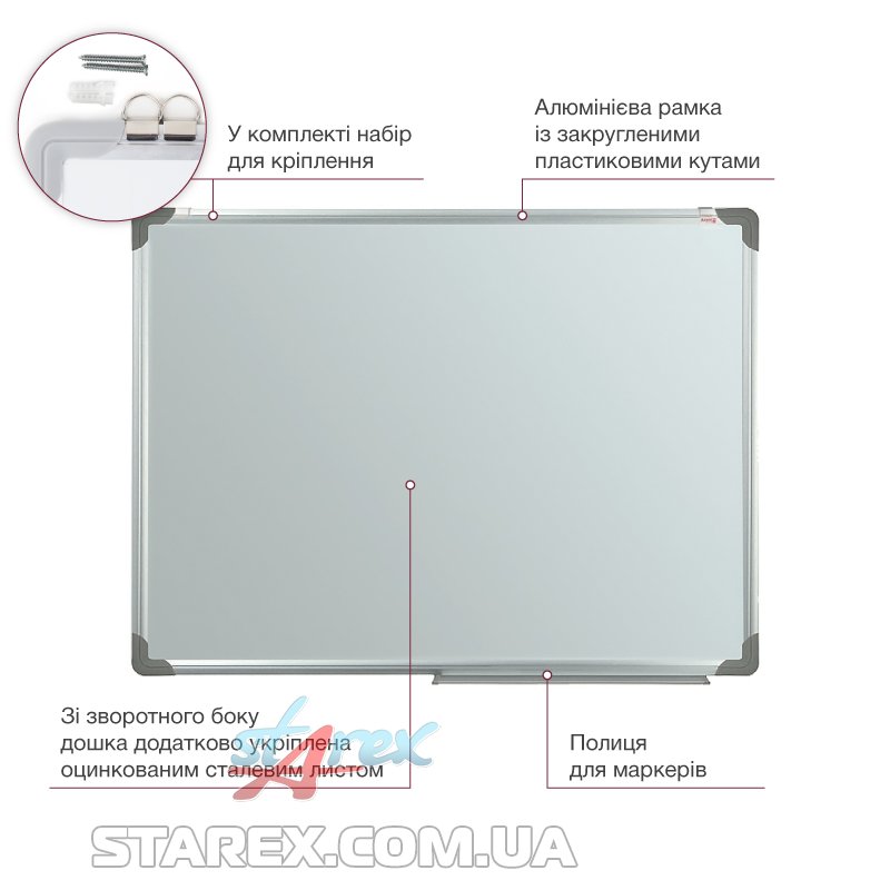 Визуальная коммуникация - незаменимый инструмент в процессе проведения презентаций, совещаний, встреч, обучающих занятий. Сухостираемые доски - один из инструментов визуальной коммуникации, они активно используются в офисах, школах, на тренингах, курсах, а также дома. Сухостираемые доски - это еще и прекрасные хранители информации: записки, счета и квитанции никогда не потеряются, если прикрепить их магнитом к доске. Сухостираемые доски Delta by Axent имеют качественное покрытие, рамка изготовлена из анодированного алюминия серебристого цвета, устойчива к царапинам и повышенной влажности. С обратной стороны доска дополнительно укреплено оцинкованным стальным листом. Рамка имеет округлённые пластиковые углы с передвижными креплениями к стене, в 2-х точках. В комплекте с доской идет полочка, куда можно положить маркеры и губки для стирания.