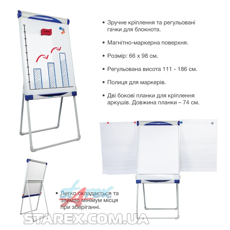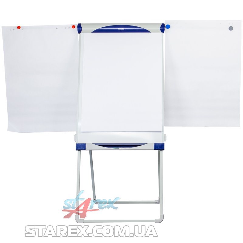 Флипчарт Axent 9705 U-Stand 66х98см – незаменимый помощник на презентациях, планерках, семинарах и совещаниях. С его помощью удобно иллюстрировать доклады графиками, схемами и другой наглядностью. Магнитно-маркерная поверхность позволяет рисовать специальными маркерами и фиксировать бумажные листы магнитами. Рабочая поверхность - 660х980мм. Выдвижные боковые планки с двух сторон позволяют закрепить дополнительные листы и втрое расширить демонстрационную зону. Основа: устойчивая U-образная база, легко складывается и занимает минимум места при хранении. Флипчарт оснащен прижимной планкой и мобильными крючками для блока бумаг. Удобная полочка-ниша для хранения маркеров и губки. Бесступенчатое регулирование высоты в любом положении