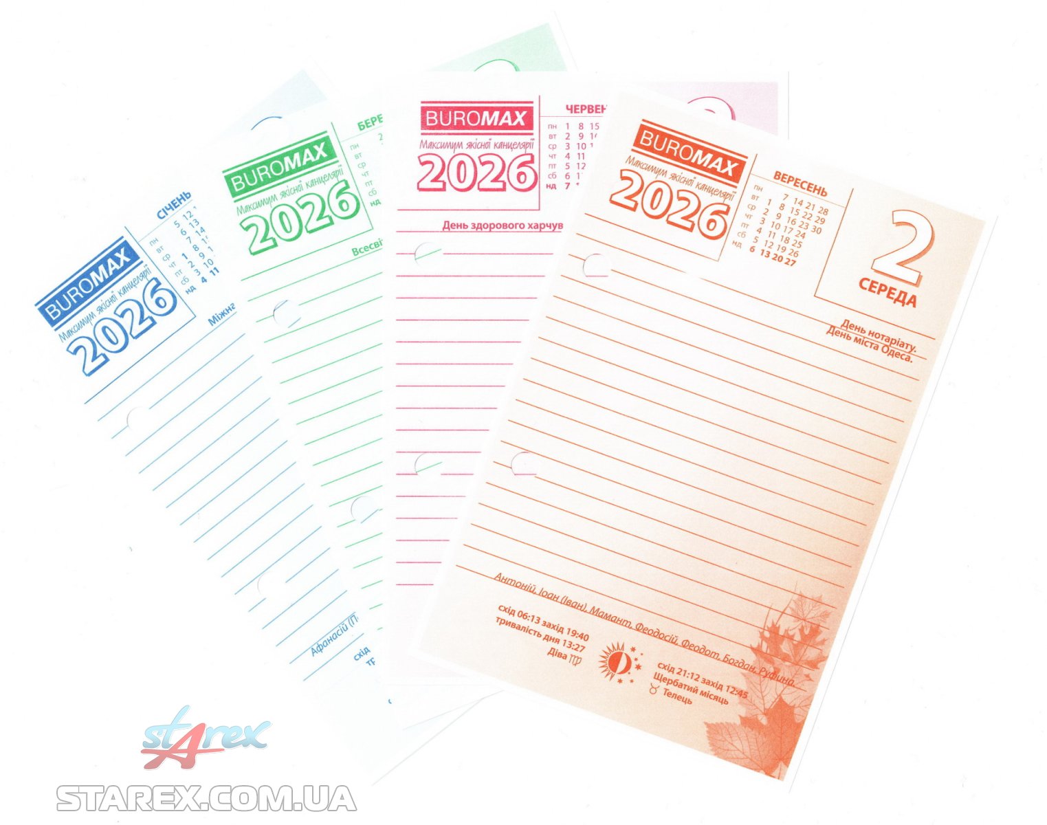 - Листы внутреннего блока расчерчены в линейку, окрашены в четыре цвета соответственно временам года и содержат полезную информацию о времени восхода (заката) солнца и луны, продолжительности дня, а также государственных, религиозных, профессиональных праздниках и именинах