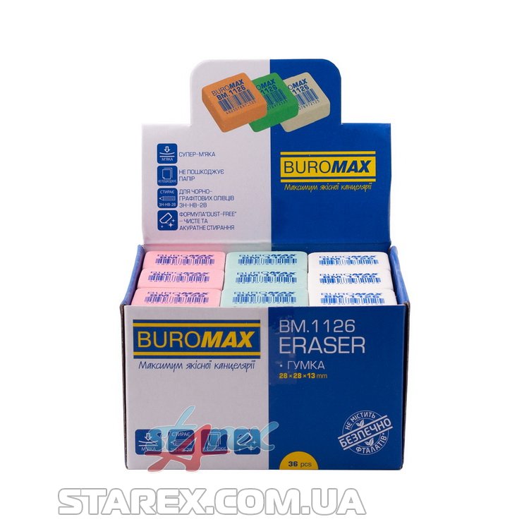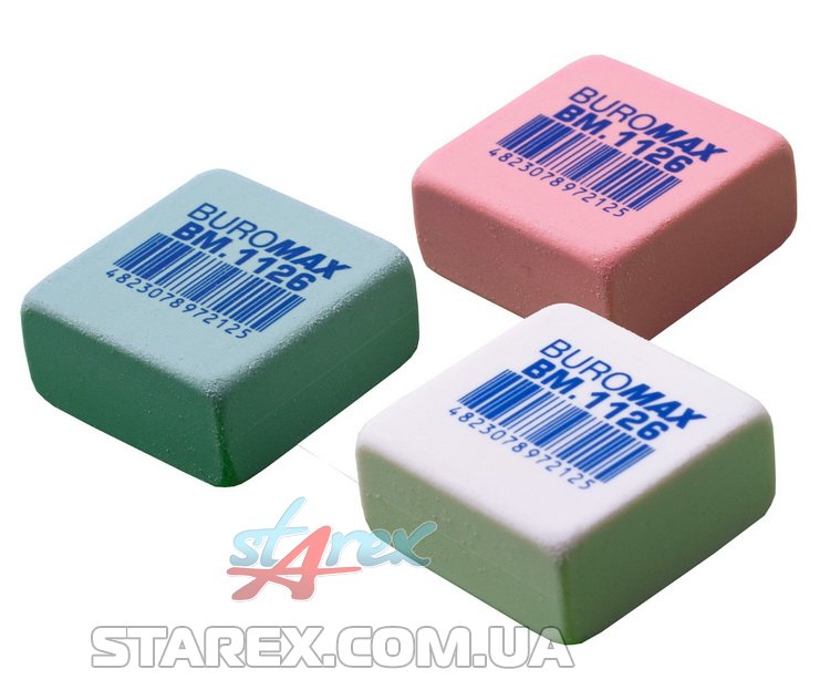 Квадратный ластик из синтетического каучука, который стирает чернографитовые карандаши твердостью 3Н-HB-2В с любых видов бумаги, в том числе, с тонких сортов, не оставляя разводов и не повреждая бумагу