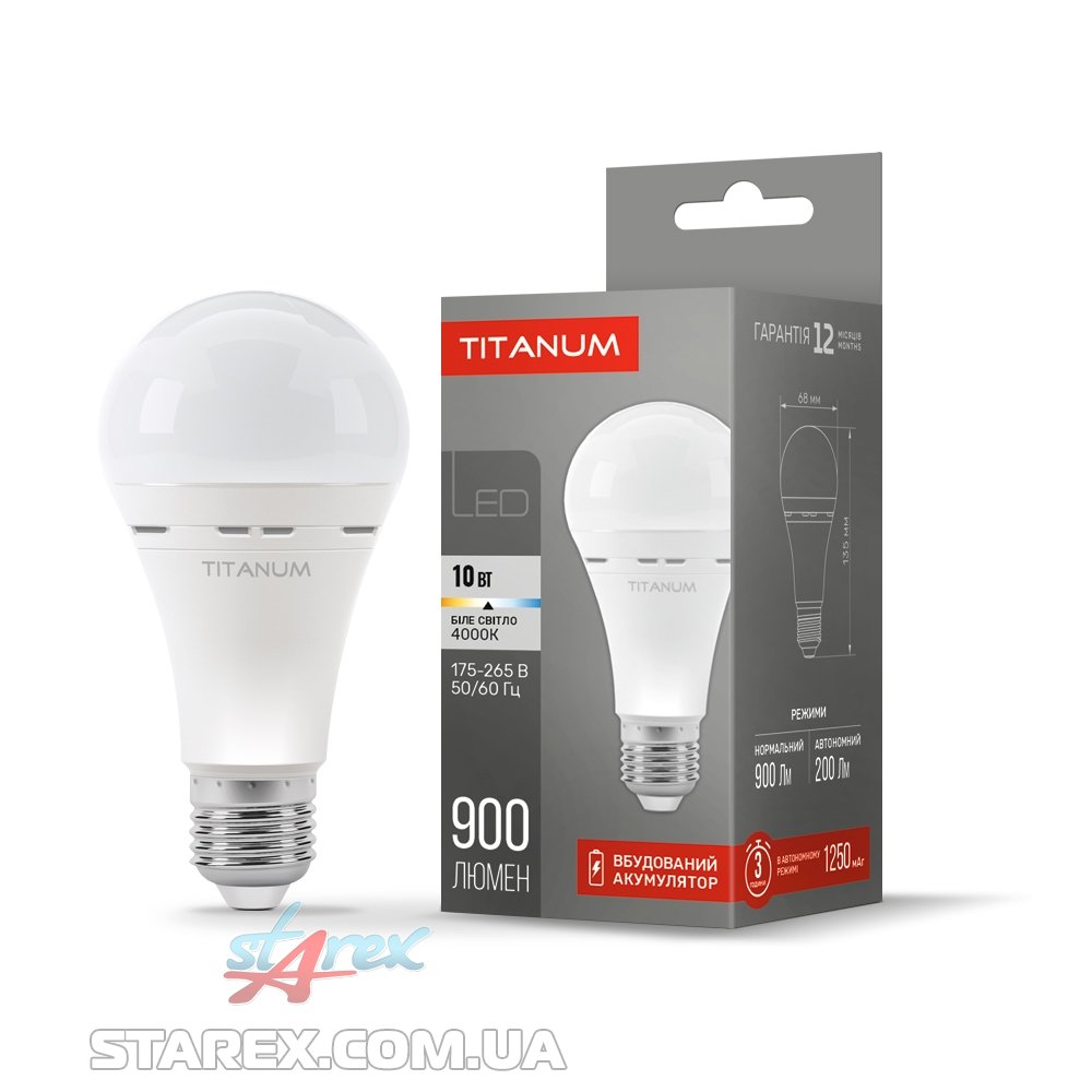 LED лампа аварійного освітленняTITANUM A68 10W E27 4000K - особливістю даної лампи є вбудований акумулятор ємністю 1250мАг, що дозволить їй працювати автономно близько 3 годин. Забезпечує рівний світловий потік і максимальну потужність з першої секунди роботи від мережі. Призначена для всіх типів побутових світильників, підходить для загального освітлення приміщень та кімнат, також виступає резервним освітленням в разі відсутності стаціонарної напруги живлення. Світлодіодні лампи покращують якість штучного освітлення, а також допомагають економити на комунальних платежах. Завдяки мінімальному спотворенню природних кольорів, якісному світла, різноманітності моделей і малому енергоспоживанню - світлодіодні лампи стали головним джерелом світла у всіх сферах людської діяльності