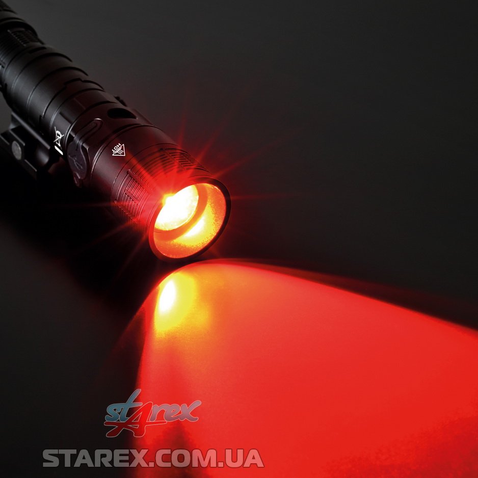 RED LOW (Червоне світло мінімальної потужності) – яскравість світла 5Lm. Дистанція освітлення налічує 15м. Тривалість роботи 120год. Інтенсивність світлового потоку 43cd.