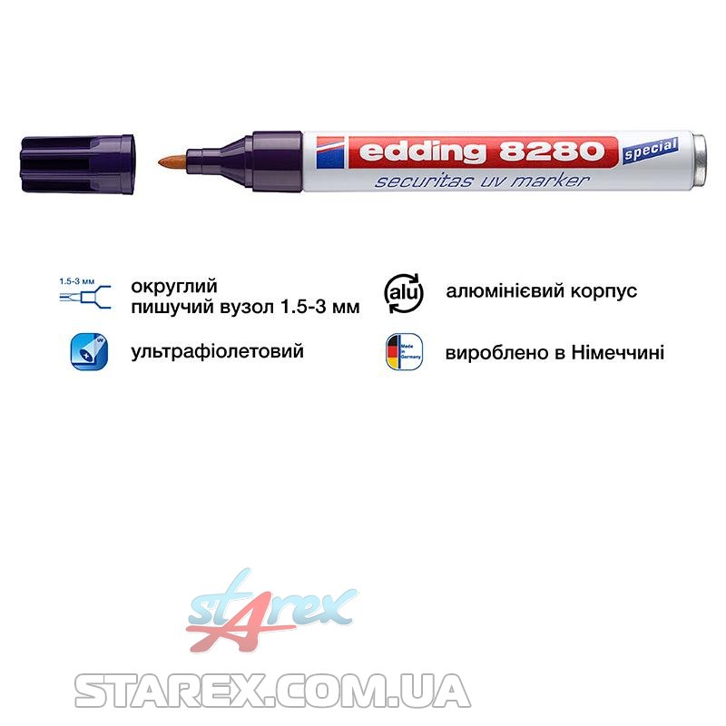 - Маркер ультрафиолетовый Edding Securitas UV E-8280 используется для нанесения скрытой маркировки, видимой только под воздействием ультрафиолетовых лучей