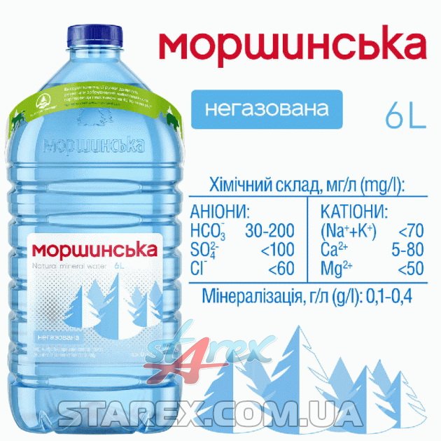 Негазированная минеральная вода Моршинская имеет природное происхождение. Вода разливается сразу после добычи непосредственно возле источника в г. Моршин, практически не контактируя с окружающей средой. Моршинская не поддается химической или механической очистке, поэтому вода сохраняет свой природный химический состав