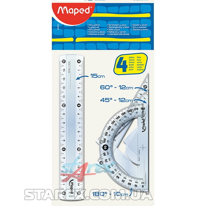 - 4 предмета в наборе: линейка 15см, угольник 60 градусов/12см, угольник 45 градусов/12см, транспортир 180 градусов/10см