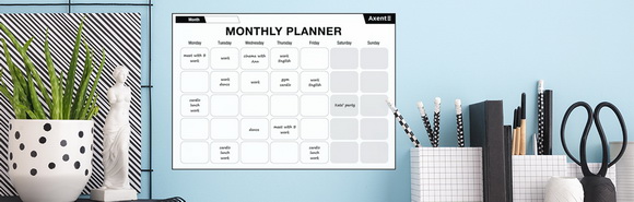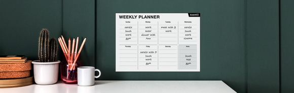 Настенные планеры Axent – это многоразовые «доски» для надписей специальным маркером (который входит в комплект). Они легко и надежно крепятся практически к любым гладким поверхностям (к стене, холодильнику, окну, шкафу и др.). Благодаря специальной технологии, настенный планер прилипает к поверхности и крепко держится без единой капли клея. Он не оставляет никаких следов и позволяет перемещать его столько раз, сколько вам захочется. В отличие от магнитных аналогов, планеры Axent можно прикреплять не только к металлическим поверхностям