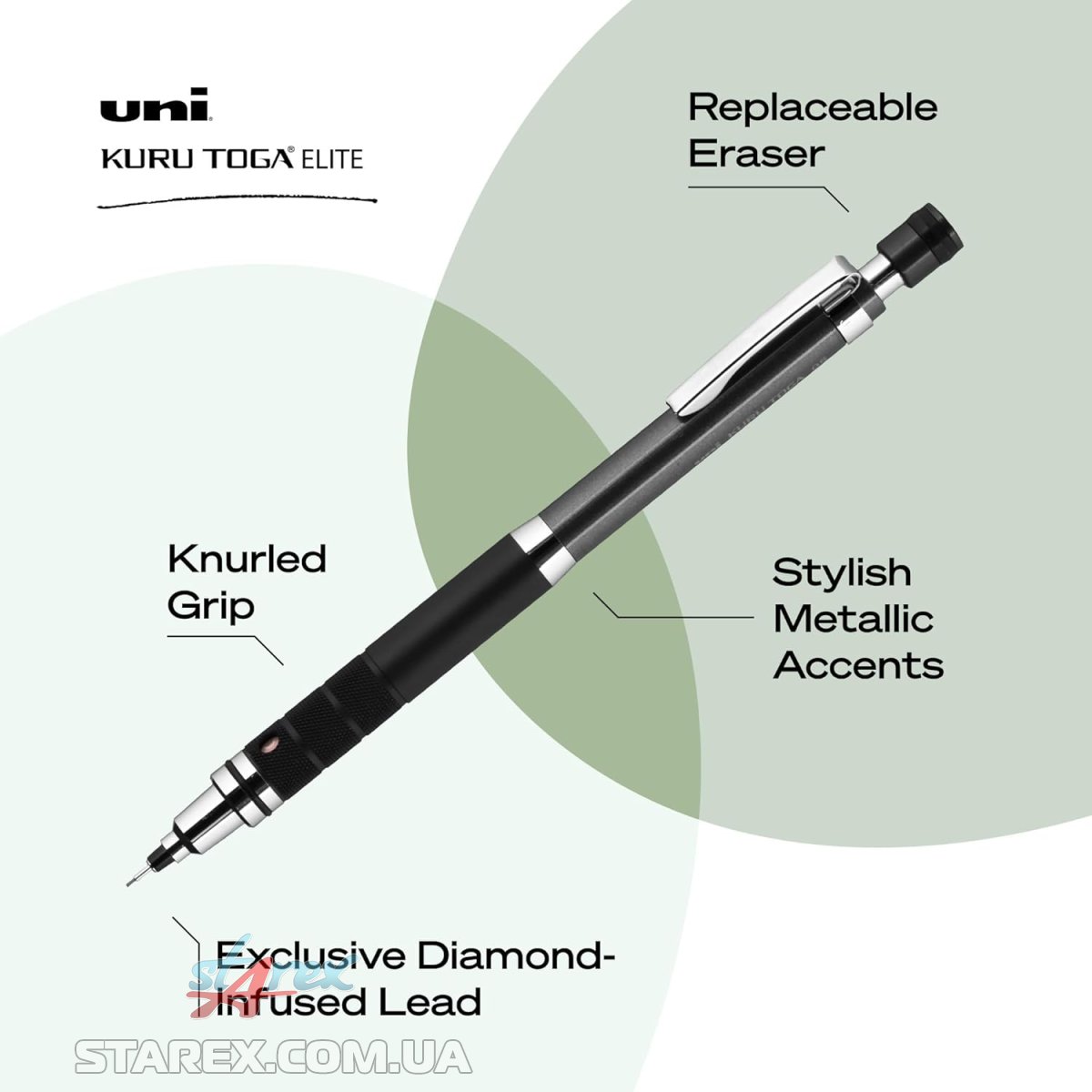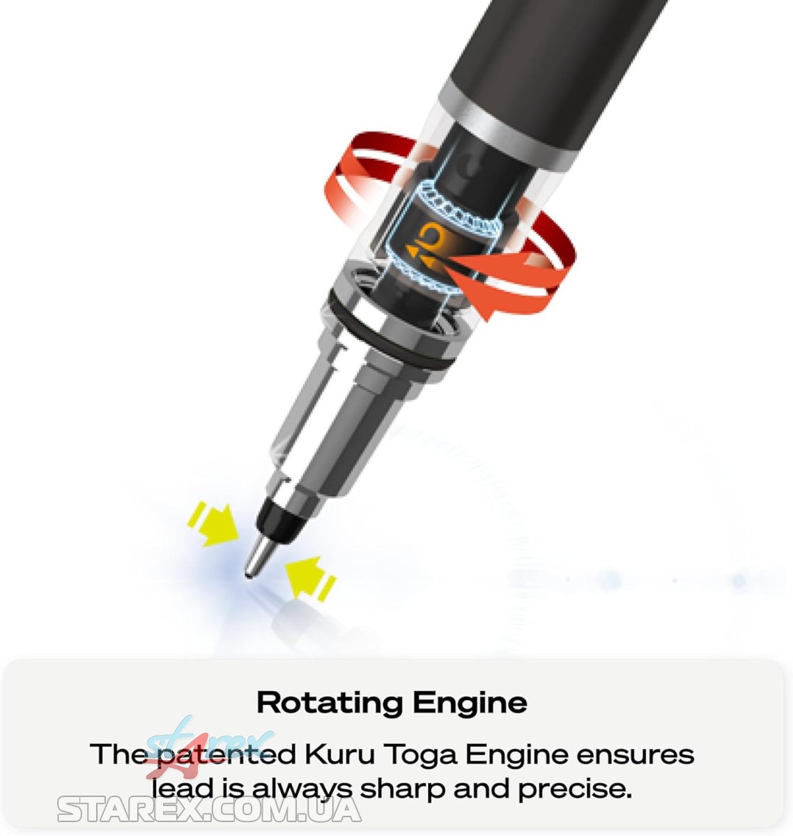 Карандаш имеет механизм Kuru Toga, который автоматически вращает стержень при каждом нажатии на бумагу, обеспечивая постоянную заточку грифеля. Имеет стильный и крепкий металлический корпус с текстурой и рифлением для удобного захвата.