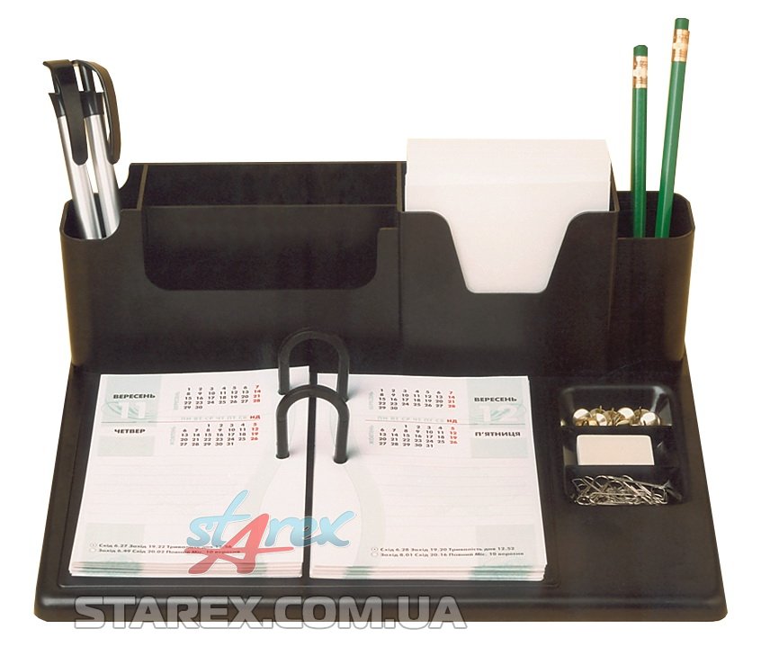 - 8 отделений: 2 для письменных принадлежностей, 3 для бумажных заметок и визиток, 3 для канцелярских мелочей: скрепок, кнопок, ластиков и т.д.