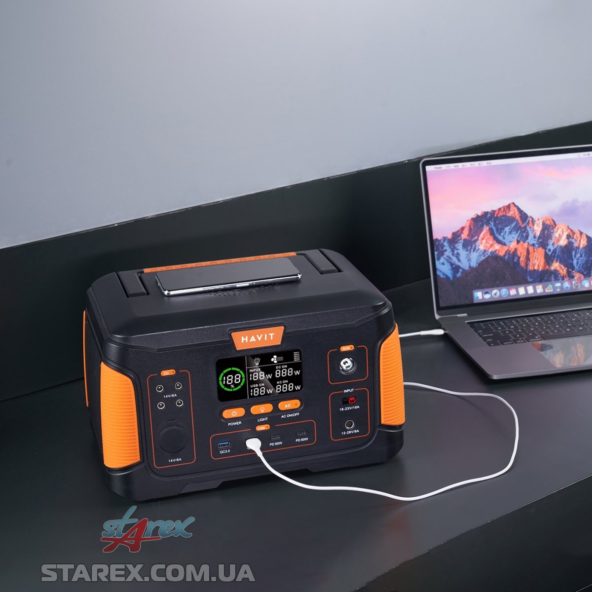 Портативна зарядна станція HAVIT J500 140400mAh 500W – являє собою мобільну батарею, яка забезпечує потужність 500Вт чистої синусоїдальної енергії змінного струму через вбудований вихід (АС) змінного струму. Окрім цього мобільна станція підтримує швидку зарядку через USB порти різних типів з підтримкою технології PD та QC.