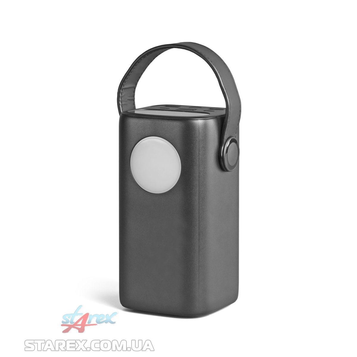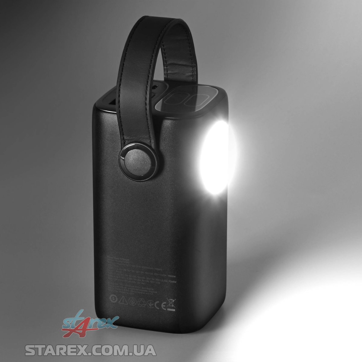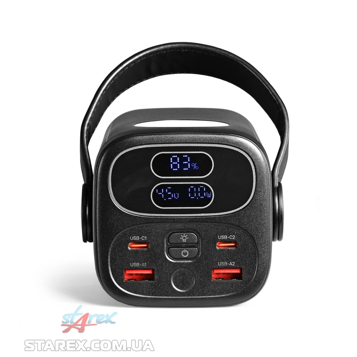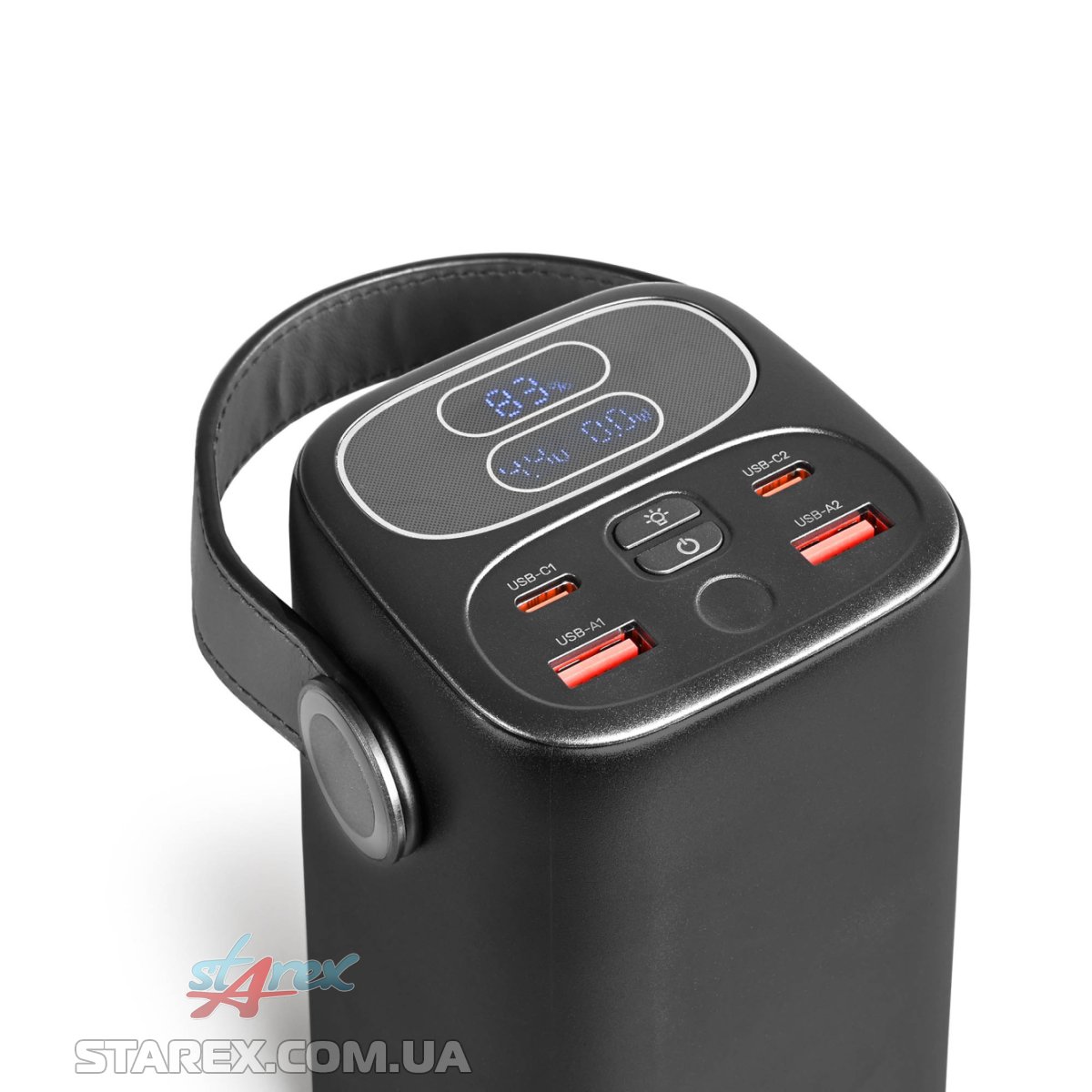Повербанк TITANUM TPB-WC40-B має ємність 40000mAh і максимальну вихідну потужність PD65W. Цей акумулятор оснащений літій-полімерною батареєю 3.7V, 148Wh, що дозволяє заряджати телефони, планшети, смарт-годинники, ноутбуки завдяки підтримці технології Power Delivery (PD). Повербанк має вбудовану LED-лампу, розташовану на лицьовій частині корпусу, яка може використовуватися в якості підсвітки на дуже близькі відстані. Для активації підсвітки достатньо затиснути на 2 секунди відповідну кнопку на корпусі повербанка. Повербанк має вбудований LED-екран, який при натисканні на кнопку живлення відображає рівень заряду, напругу й потужність в поточний момент. Додатковою перевагою даної моделі є оснащення її ручкою, що полегшує процес транспортування виробу. Розміри виробу – 143х85х75мм, вага – 945г.