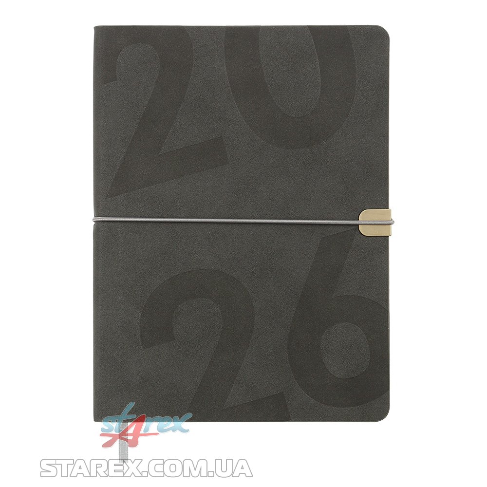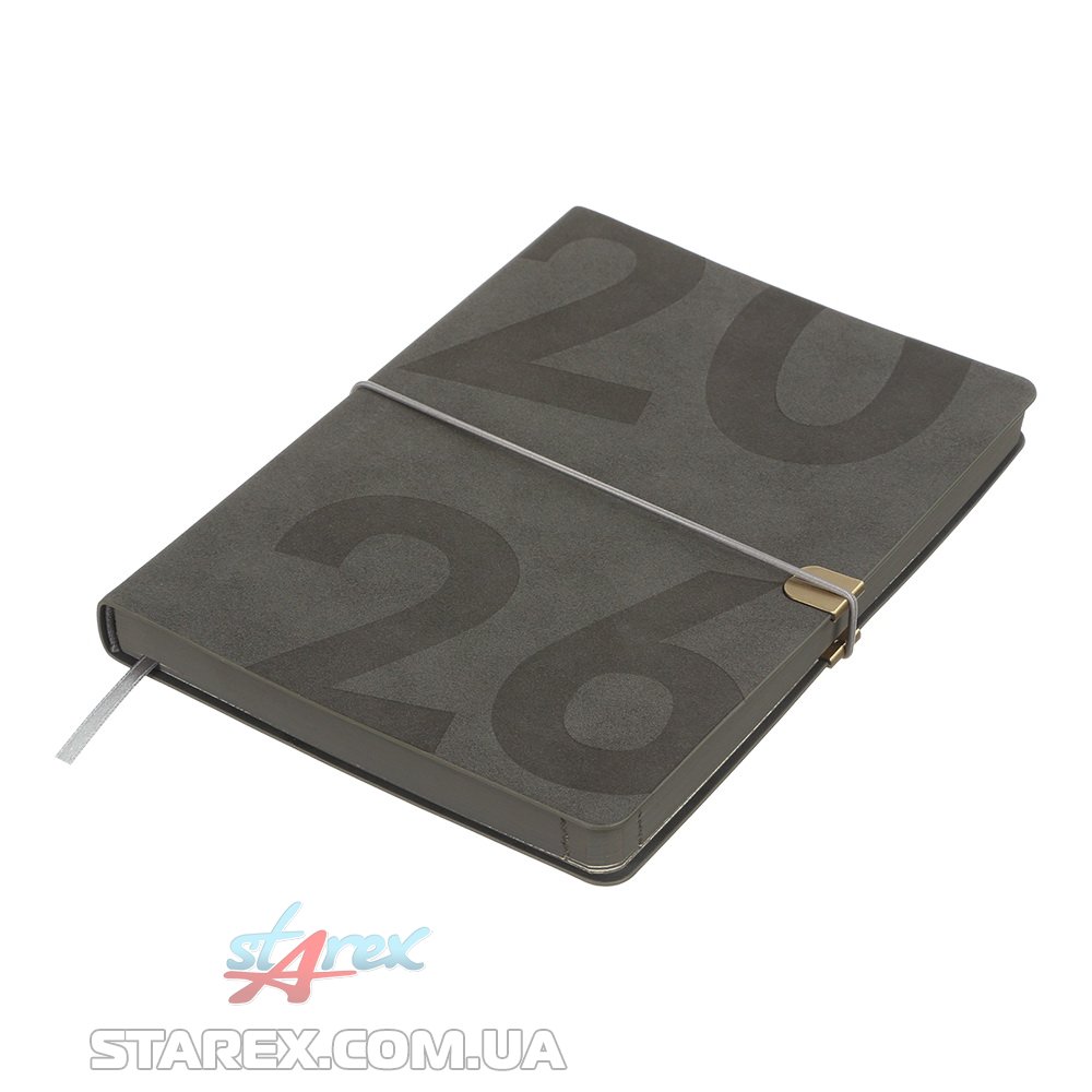 Гибкая обложка ежедневника BEST выполнена из искусственной кожи c бархатистой фактурой типа soft-touch. Уникальной особенностью модели является оригинальное декоративное тиснение года, выполненное по всей лицевой стороне обложки. Поперечная резинка надежно фиксирует ежедневник в закрытом состоянии и поможет сохранить все важные записи и планы. Дизайн гармонично дополняет тонированный срез в цвет обложки и металлические шильды-накладки с углублениями на лицевой и задней части обложки, на которые ложится резинка