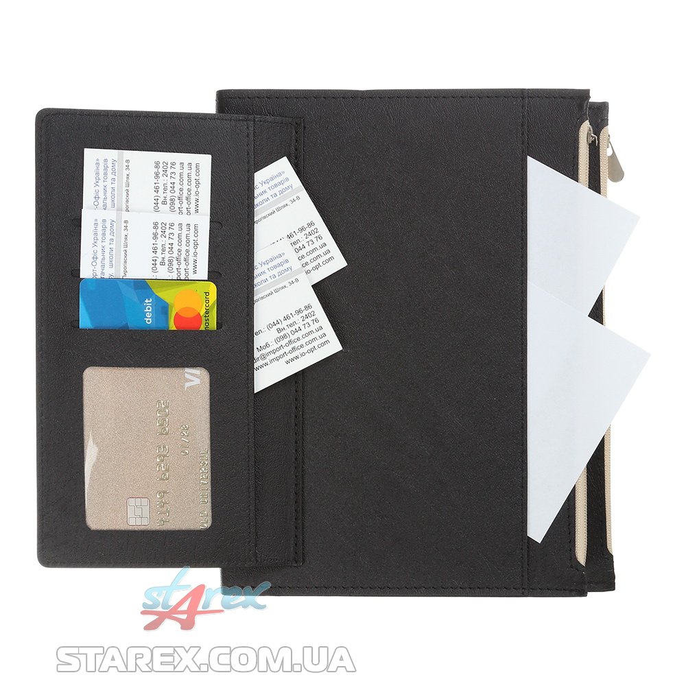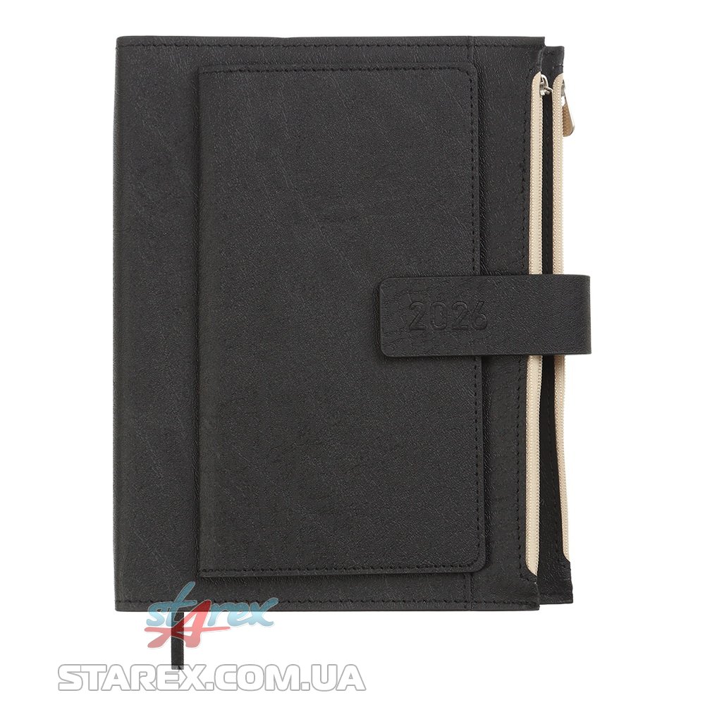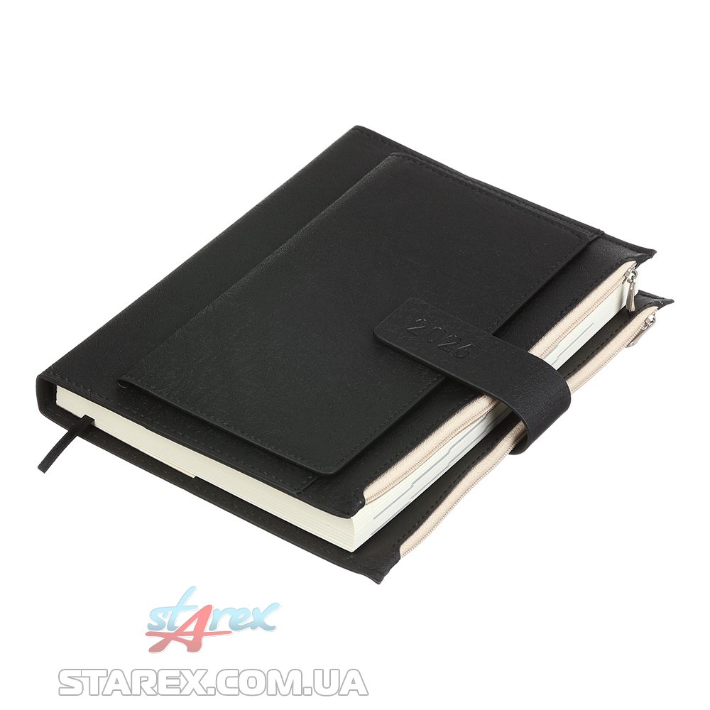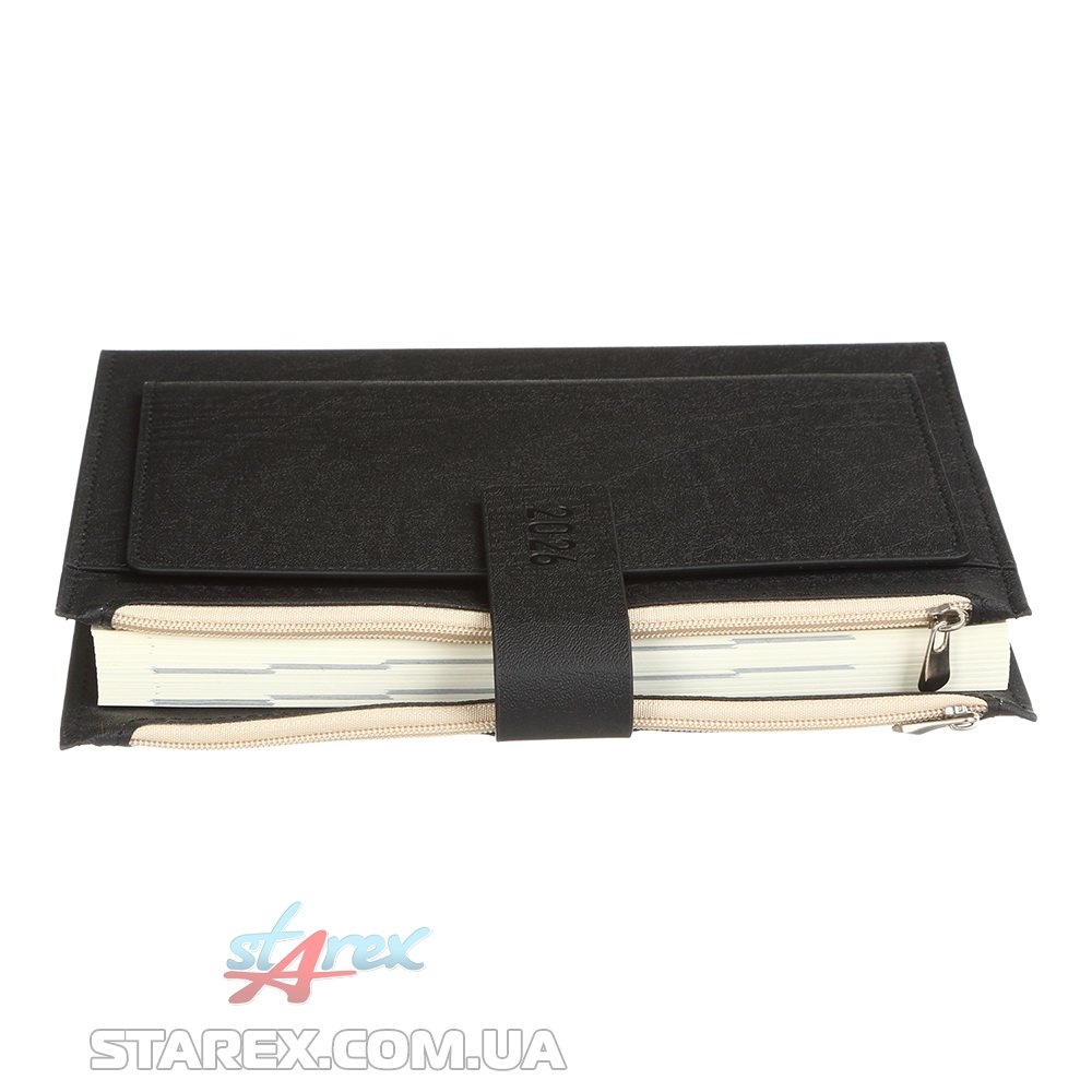 Съемная обложка – органайзер ежедневника ENIGMA изготовлена из искусственной кожи с фактурой натуральной кожи. Обложка имеет два глубоких кармана на молнии вдоль края обложки на ее лицевой и обратной сторонах, глубокий открытый карман для заметок, бумажек и мелочей. Также на лицевой стороне расположен клапан с тремя отделениями для пластиковых карт и визиток. Магнитный хлястик-застежка, на котором гармонично нанесено слепое тиснение года, поможет зафиксировать клапан обложки и ежедневник в закрытом положении
