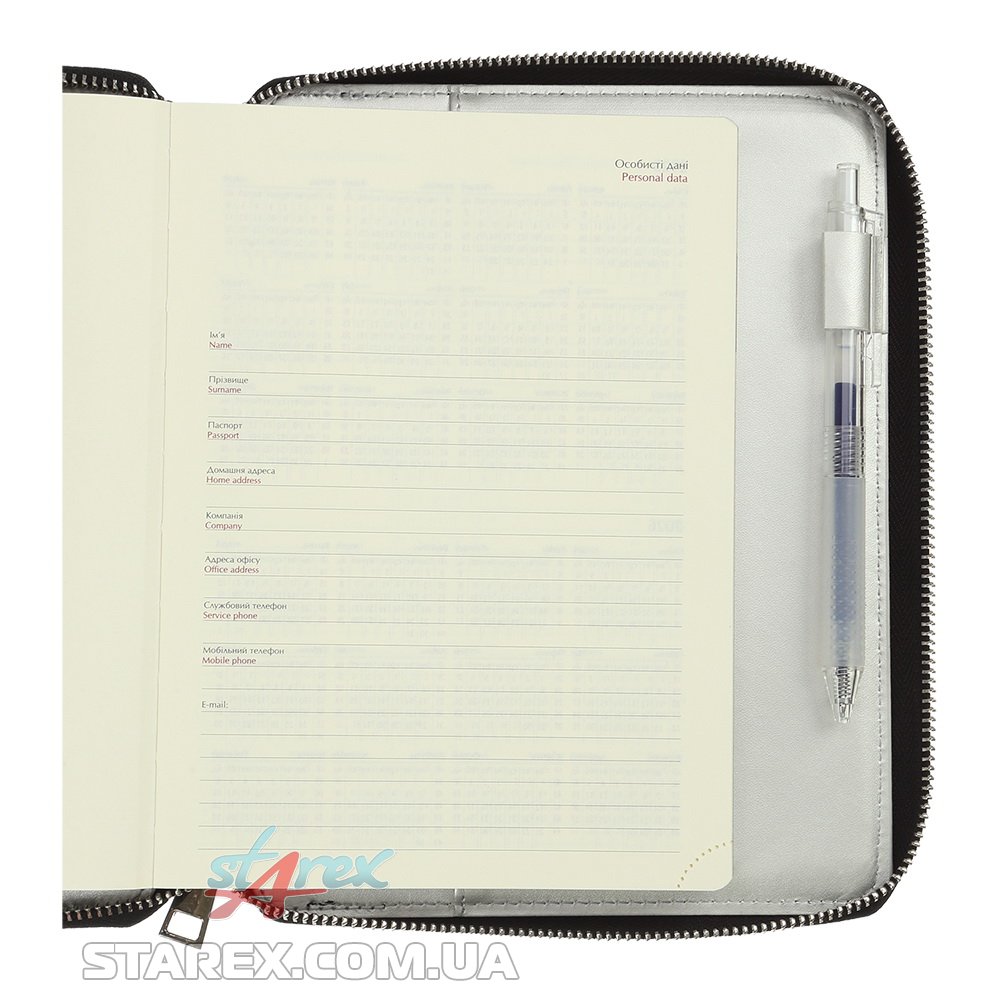 Ежедневник PRIMAVERA – это очень стильный аксессуар и незаменимый помощник современного человека. Съемная обложка из искусственной кожи с поролоном выполнена в виде клатча, закрывающегося на серебристую молнию. Это очень удобно – ведь так дневник надежно фиксируется в закрытом состоянии. На внутренней стороне обложки размещены завес для ручки, а также клапан-карман, на котором расположены 3 отделения для визиток, карточек и мелких записей. Внутренняя сторона обложки, первый лист ежедневника с тиснением года и срез гармонично выполнены в серебристом цвете.
