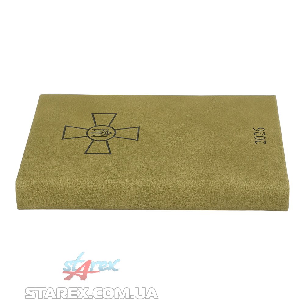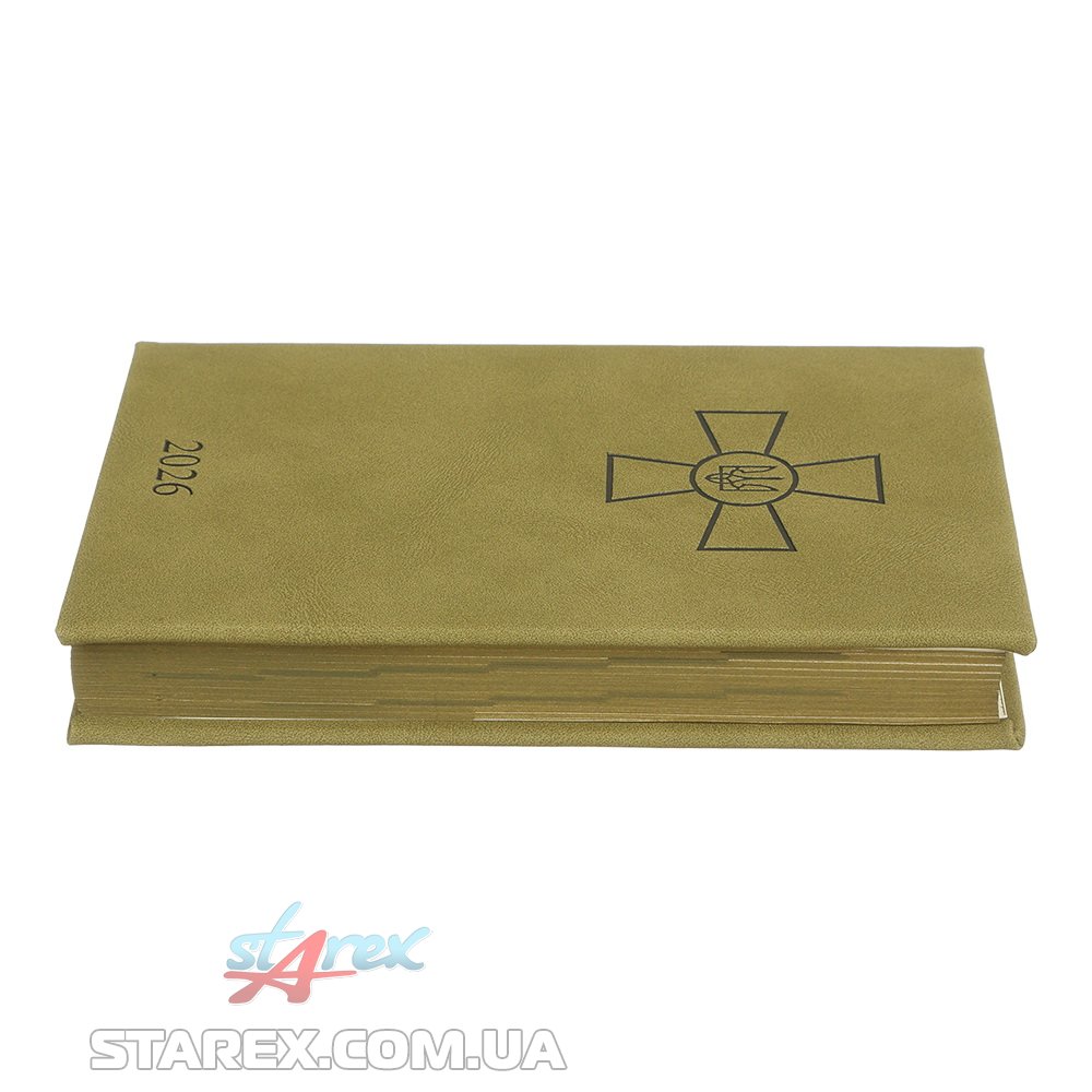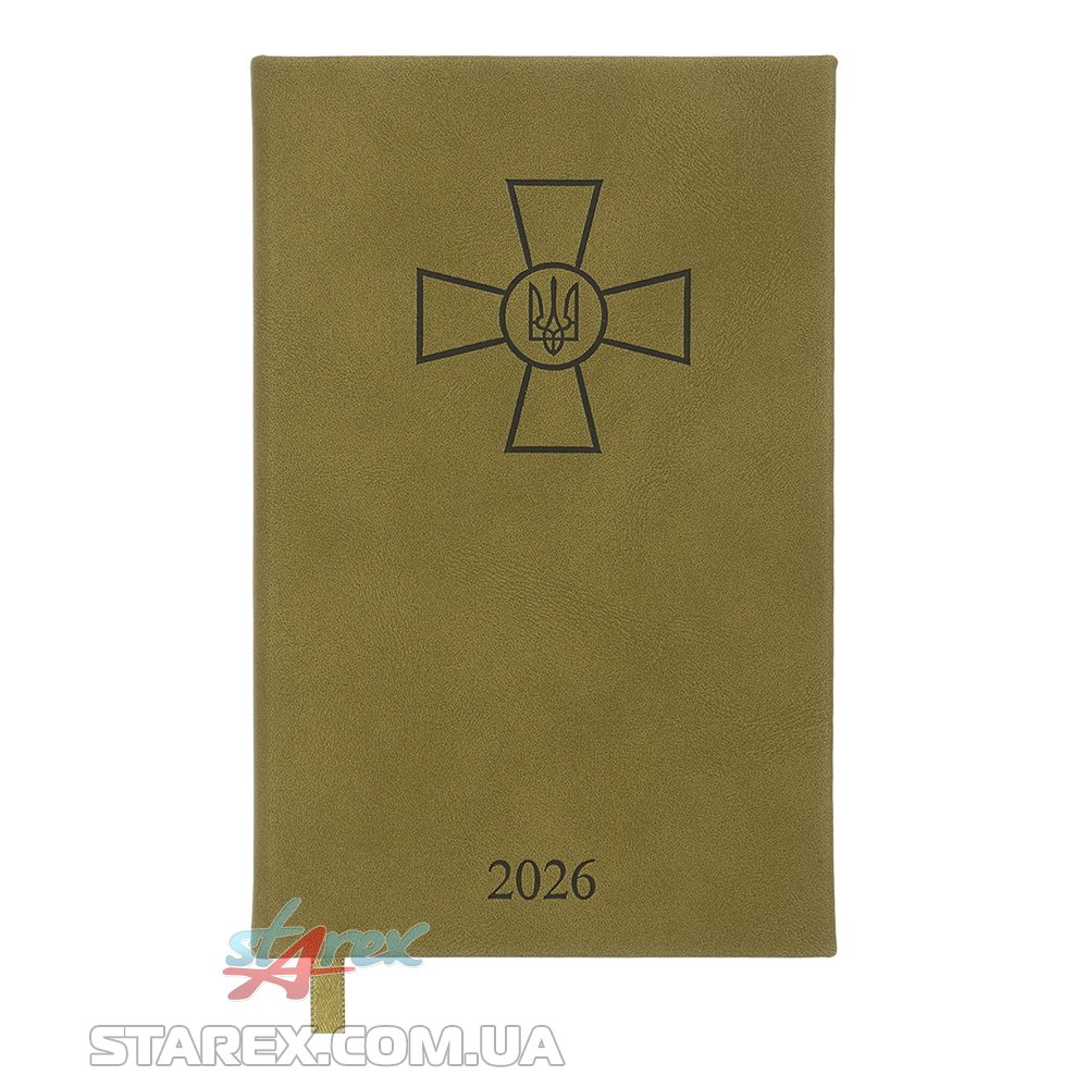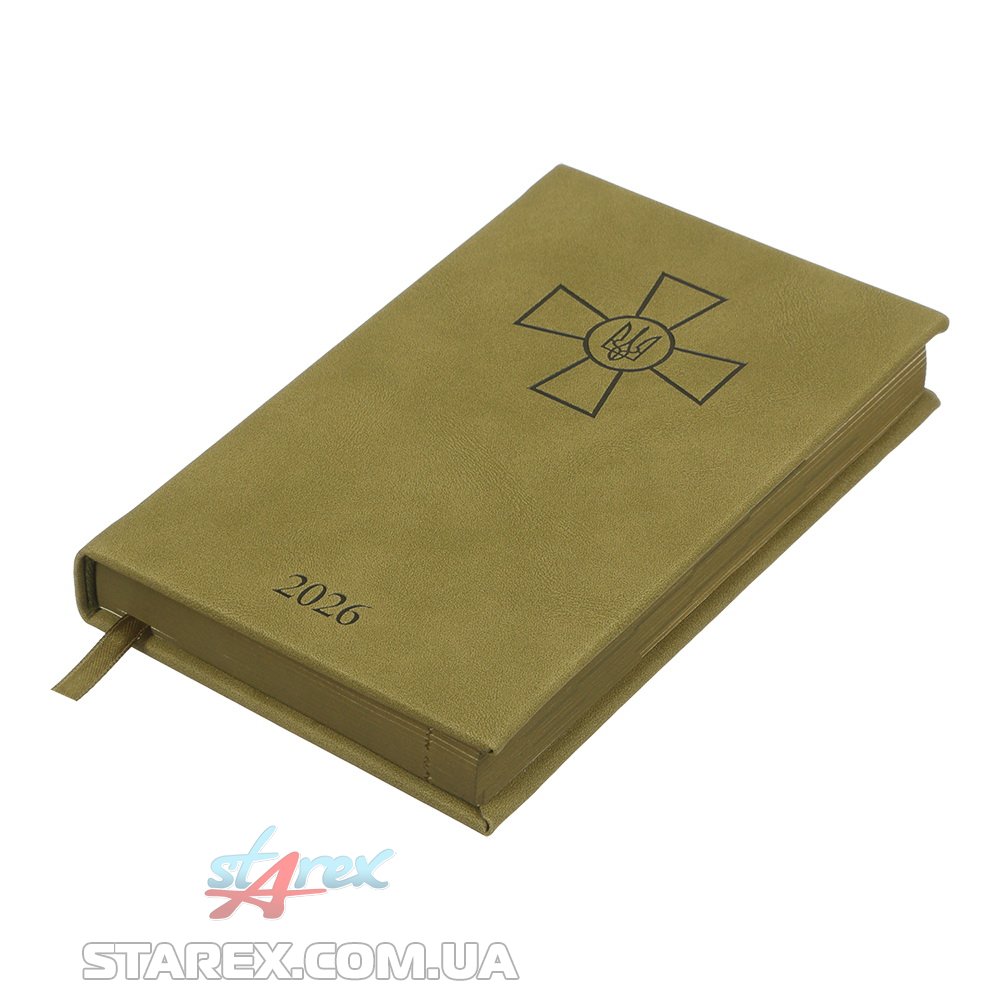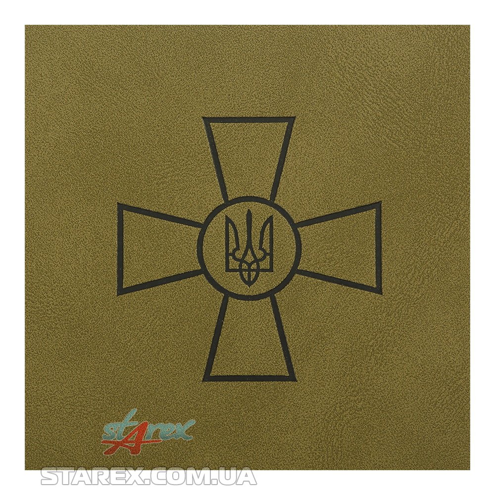 Жесткая обложка из гладкой искусственной кожи с поролоном ежедневника FORCES выполнена в выдержанном и мужественном стиле с военной тематикой - украшена слепым тиснением Креста ВСУ. Гармонично дополняет дизайн ежедневника тонированный в цвет обложки срез внутреннего блока и слепое тиснение года