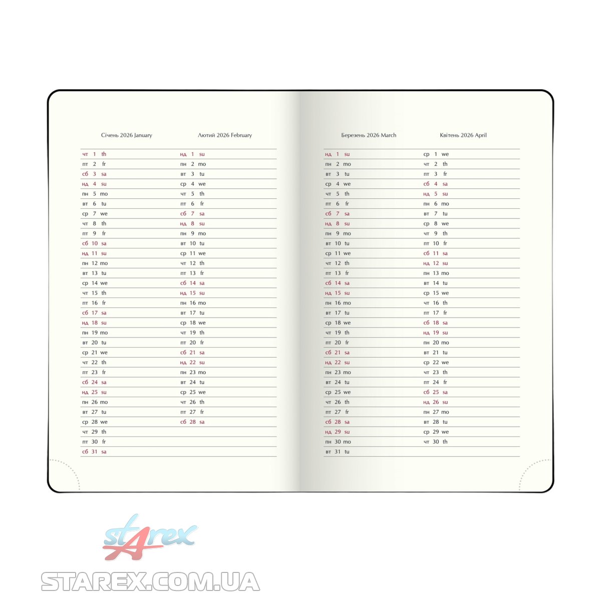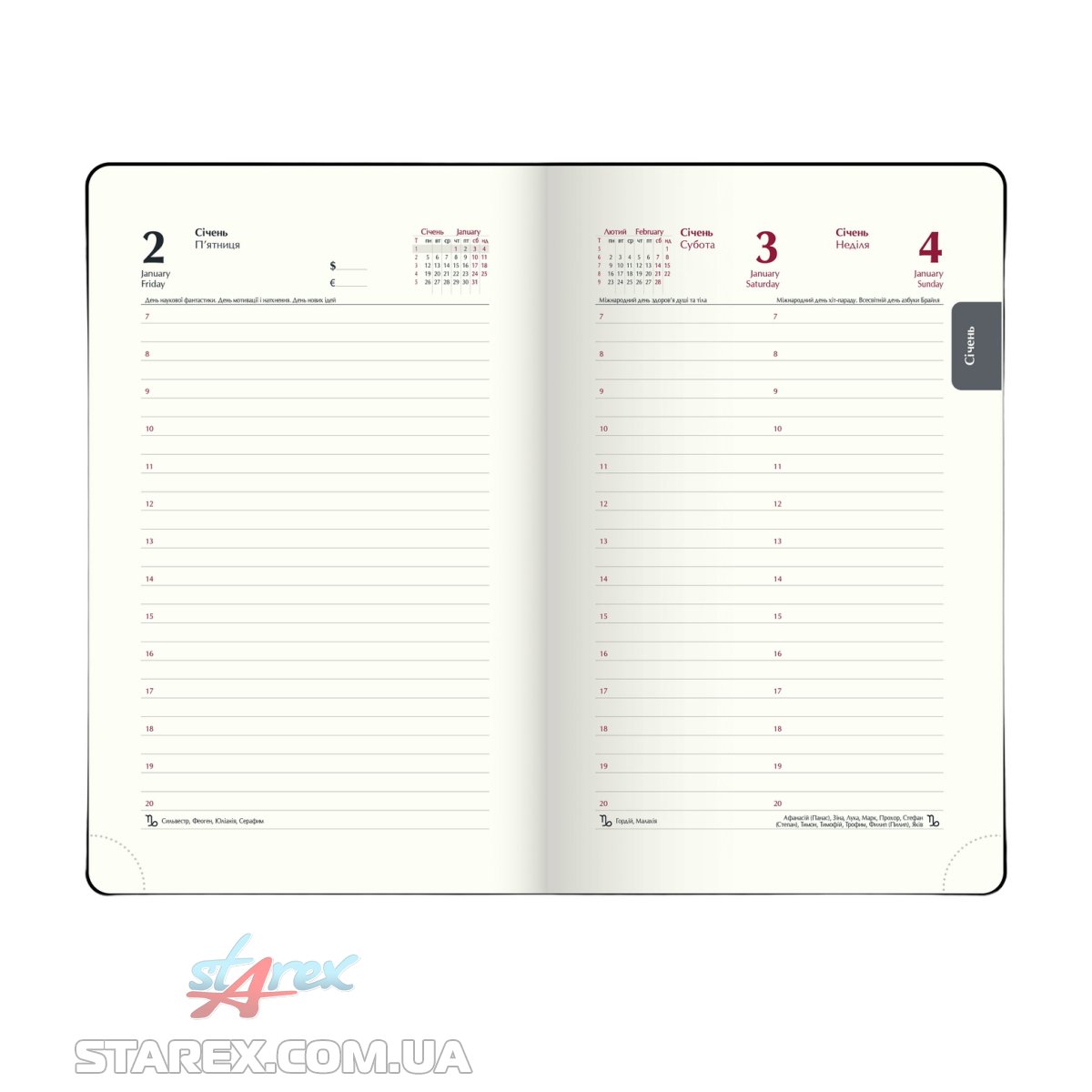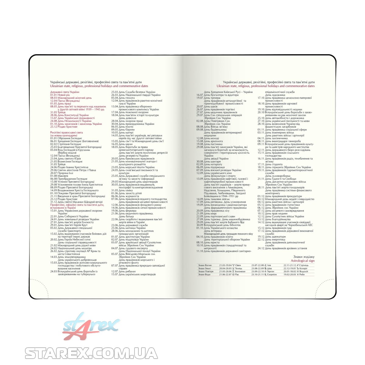 - Датированная страница на каждый день года с организатором времени с 7:00 до 21:00, календарем на текущий/следующий месяц, обозначением дня недели, знака зодиака, именинников