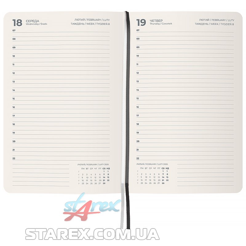 - Щоденник містить календар на 2026-2027 рік, загальний тижневий розклад, інформацію про свята, важливі номери телефонів, часові пояси країн світу, одиниці вимірювання, шкалу температур