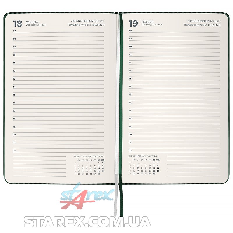 - Щоденник містить календар на 2026-2027 рік, загальний тижневий розклад, інформацію про свята, важливі номери телефонів, часові пояси країн світу, одиниці вимірювання, шкалу температур