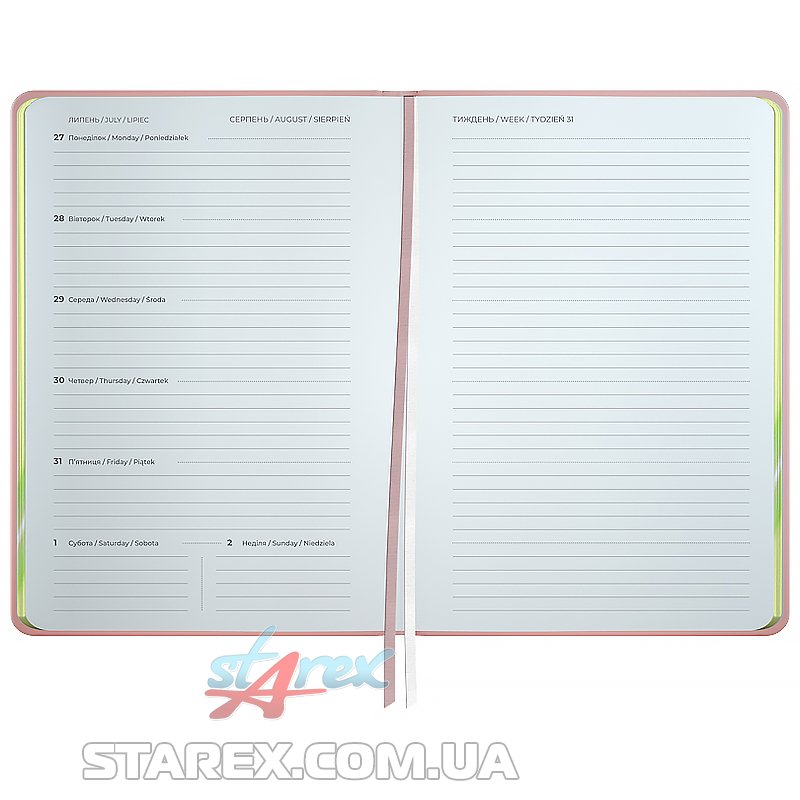 - Щоденник містить календар на 2026-2027 рік, загальний тижневий розклад, інформацію про свята, важливі номери телефонів, часові пояси країн світу, одиниці вимірювання, шкалу температур