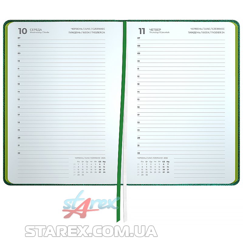 - Щоденник містить календар на 2026-2027 рік, загальний тижневий розклад, інформацію про свята, важливі номери телефонів, часові пояси країн світу, одиниці вимірювання, шкалу температур