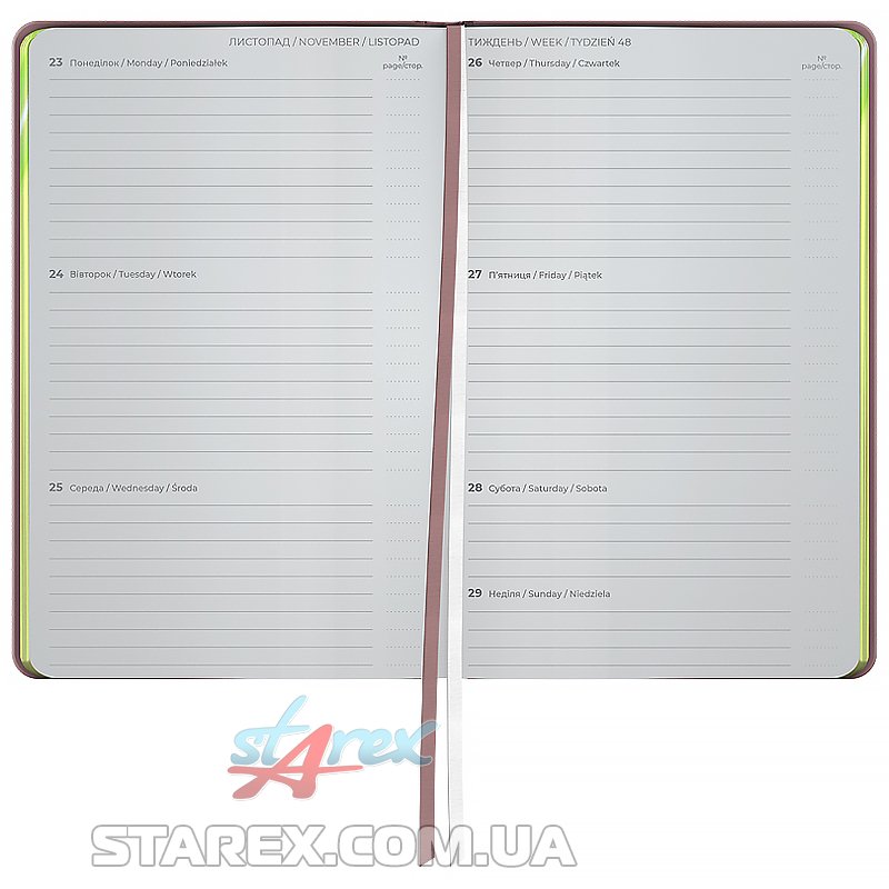 - Щотижневик поділений на 2 частини – датований блок у лінію для зручного планування справ і додаткові сторінки у клітинку для ведення особистих записів