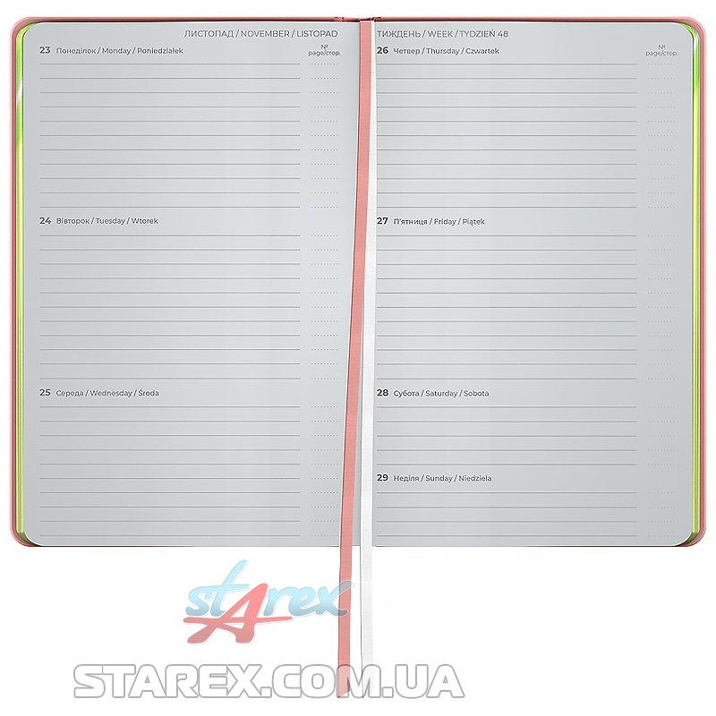- Щотижневик поділений на 2 частини – датований блок у лінію для зручного планування справ і додаткові сторінки у клітинку для ведення особистих записів