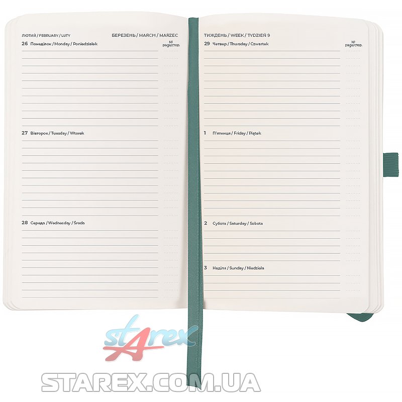 - Щотижневик поділений на 2 частини – датований блок у лінію для зручного планування справ і додаткові сторінки у клітинку для ведення особистих записів
