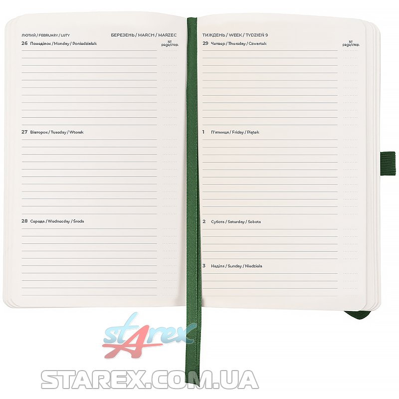 - Щотижневик поділений на 2 частини – датований блок у лінію для зручного планування справ і додаткові сторінки у клітинку для ведення особистих записів