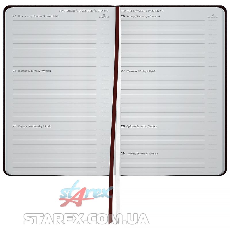 - Щотижневик поділений на 2 частини – датований блок у лінію для зручного планування справ і додаткові сторінки у клітинку для ведення особистих записів