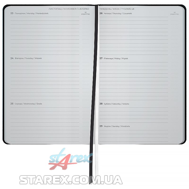 - Щотижневик поділений на 2 частини – датований блок у лінію для зручного планування справ і додаткові сторінки у клітинку для ведення особистих записів