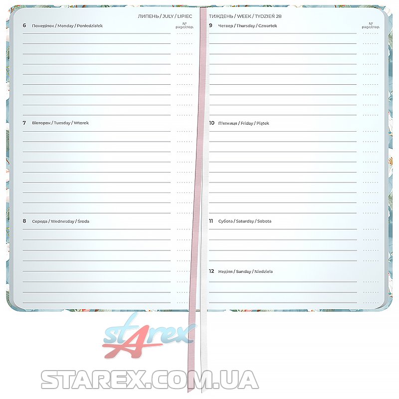 - Щотижневик поділений на 2 частини – датований блок у лінію для зручного планування справ і додаткові сторінки у клітинку для ведення особистих записів