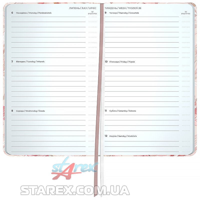 - Щотижневик поділений на 2 частини – датований блок у лінію для зручного планування справ і додаткові сторінки у клітинку для ведення особистих записів