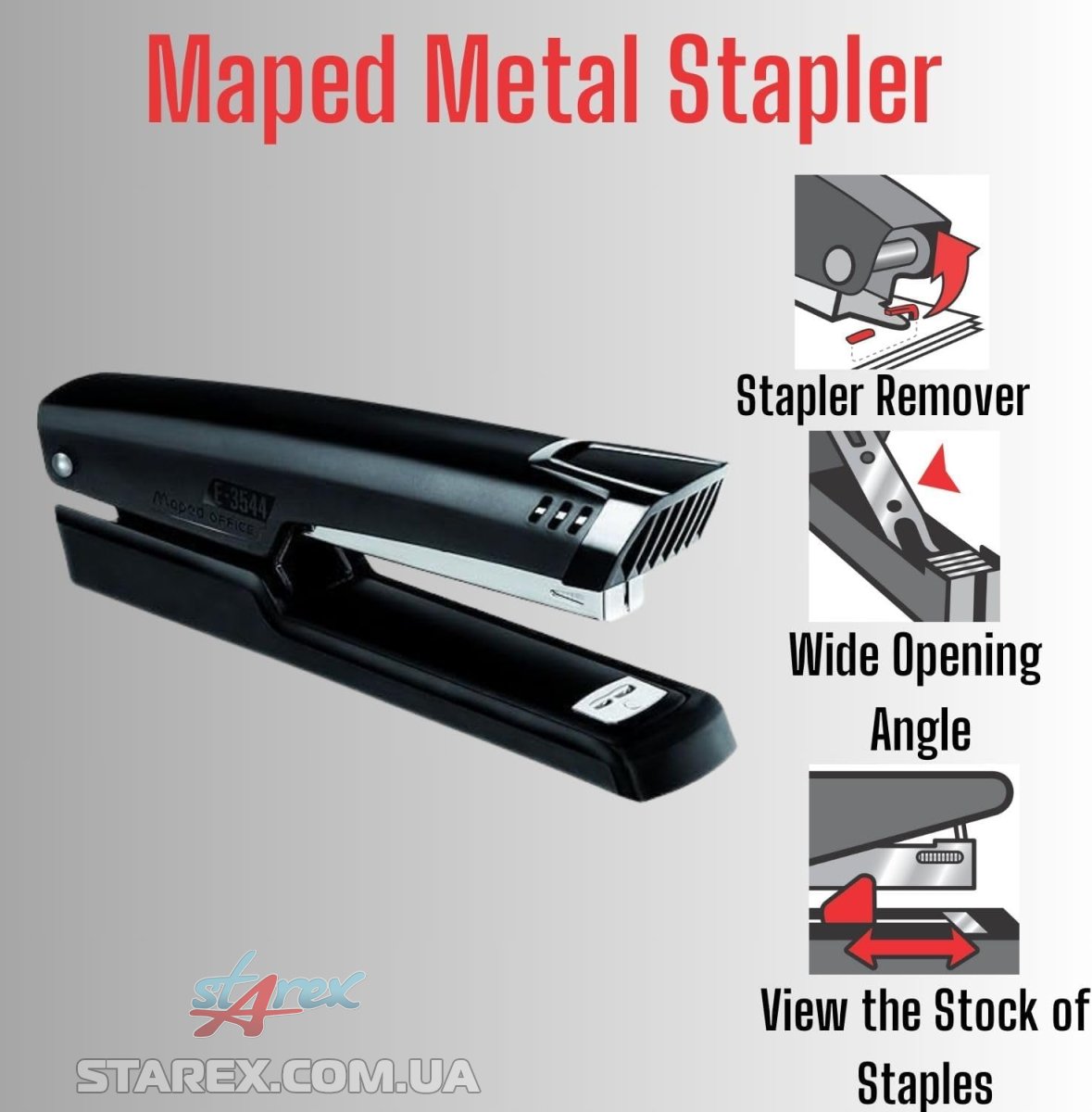 - Открывается на 180° для удобной заправки скобами