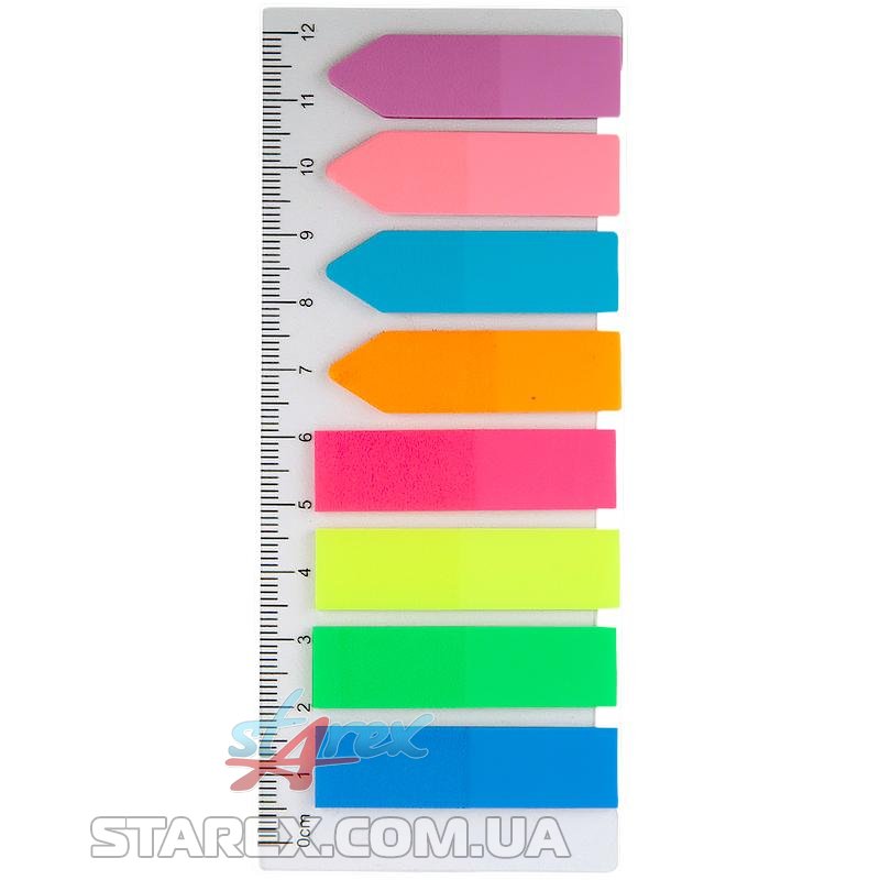 - 8 цветов (8 блочков) по 25шт. в удобном диспенсере с нанесением шкалы измерения длины (с линейкой)