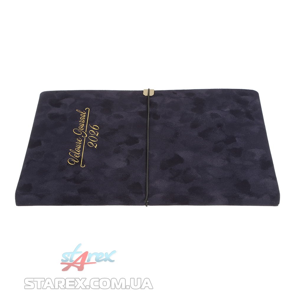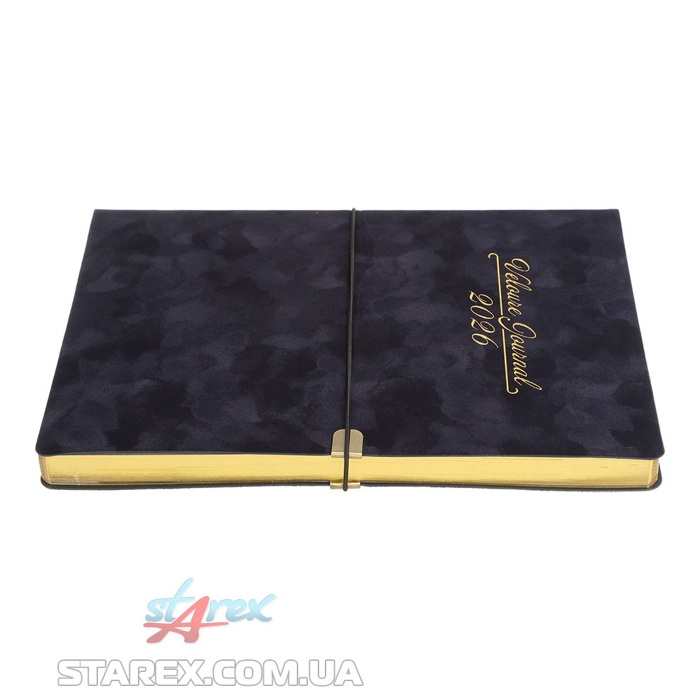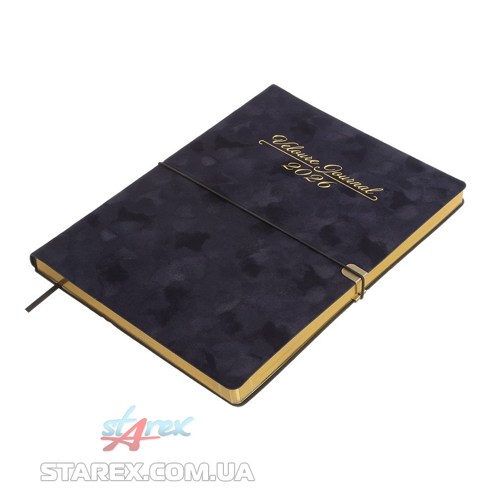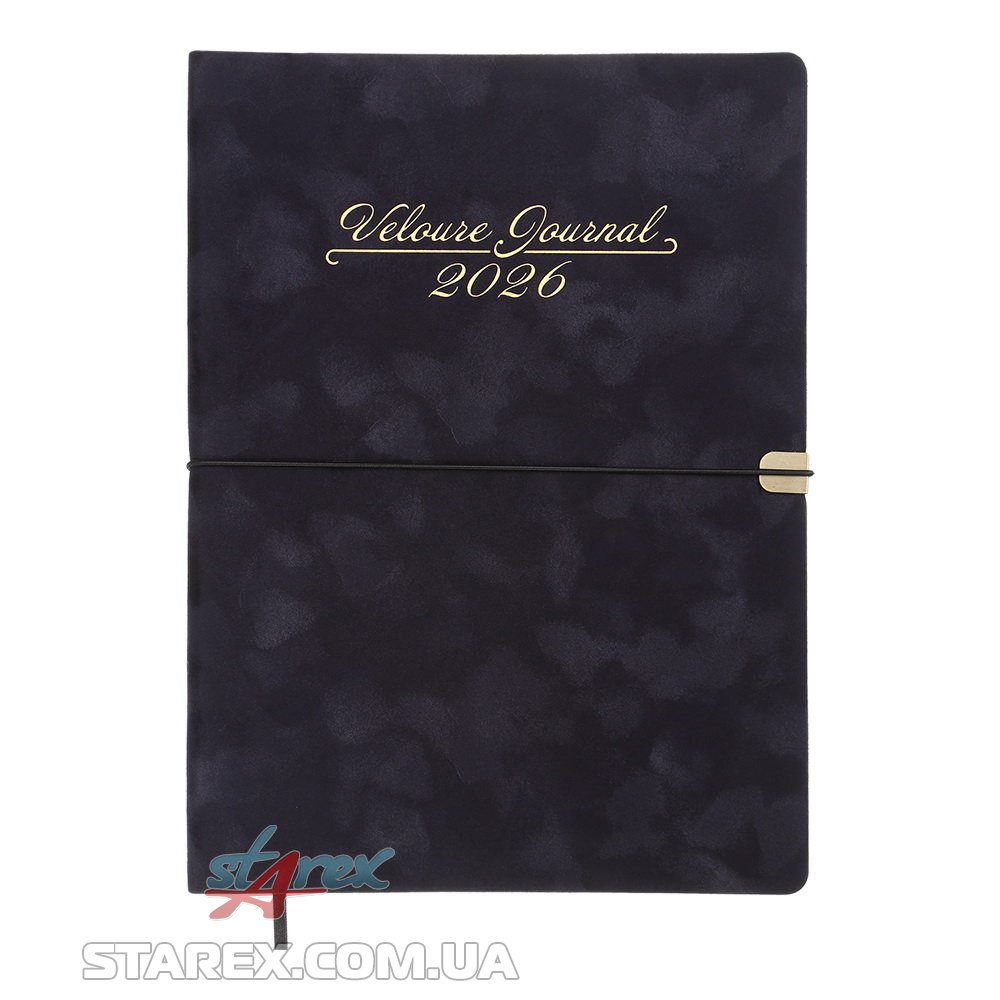 Гнучка обкладинка щоденника VELOUR виконана з штучної шкіри з виразним оксамитовим покриттям. Дві функціональні шильди на лицьовій та зворотній стороні обкладинки з поглибленнями для поперечної гумки забезпечують зручну та надійну фіксацію щоденника в закритому стані. Дизайн гармонійно доповнює та збагачує тонований золотим кольором зріз внутрішнього блоку та тиснення золотою фольгою року і напису на лицьовій стороні обкладинки